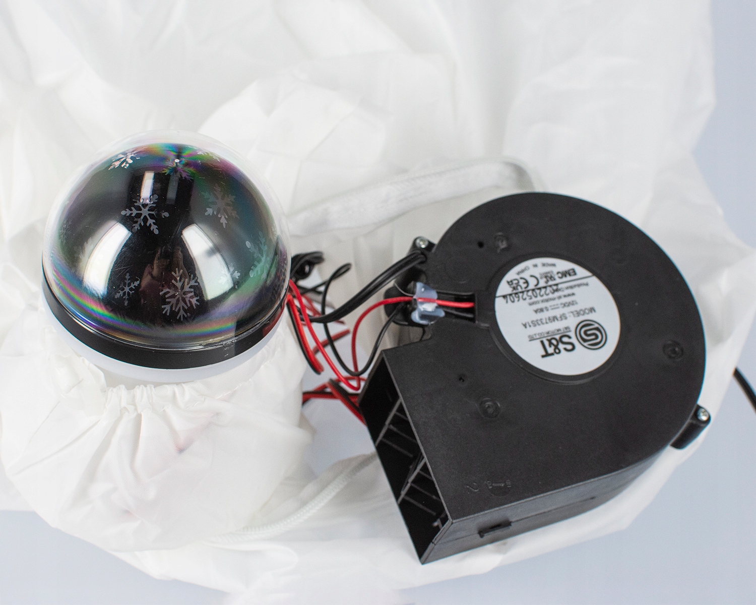 Bałwanek posiada wbudowany kompresor, który napełnia go powietrzem. Dodatkowo dekoracja ma wbudowany obrotowy projektor LED, który podświetla go od środka. Po zmroku bałwanek mieni się gwiazdkami w różnych barwach bieli.