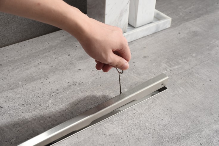 - Odpływ posiada łatwo demontowalny panel, który pozwala na szybkie dostanie się do osadnika, a dzięki dołączanemu do zestawu haczykowi jest to niezmiernie łatwe zadanie.