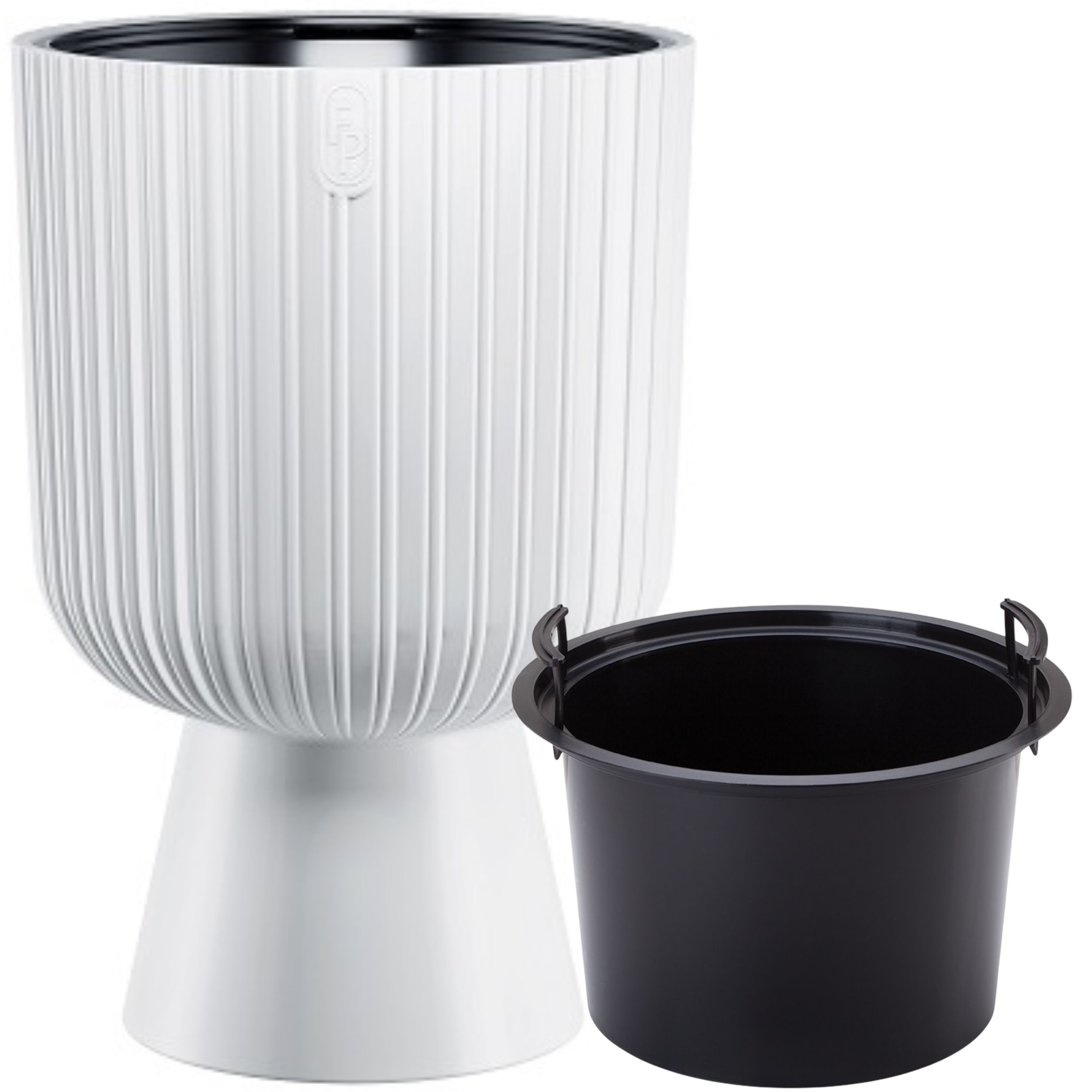 - Doniczka okrągła Keli Mika 30, Biały. Duża, okrągła doniczka o prążkowanej fakturze pionowych żłobień, z poszerzaną ku dołowi, gładką nóżką. Doniczka w kolorze białym z czarnym wkładem. Piękny, nowoczesny wzór nada wnętrzu elegancji i przyciągnie wzrok go