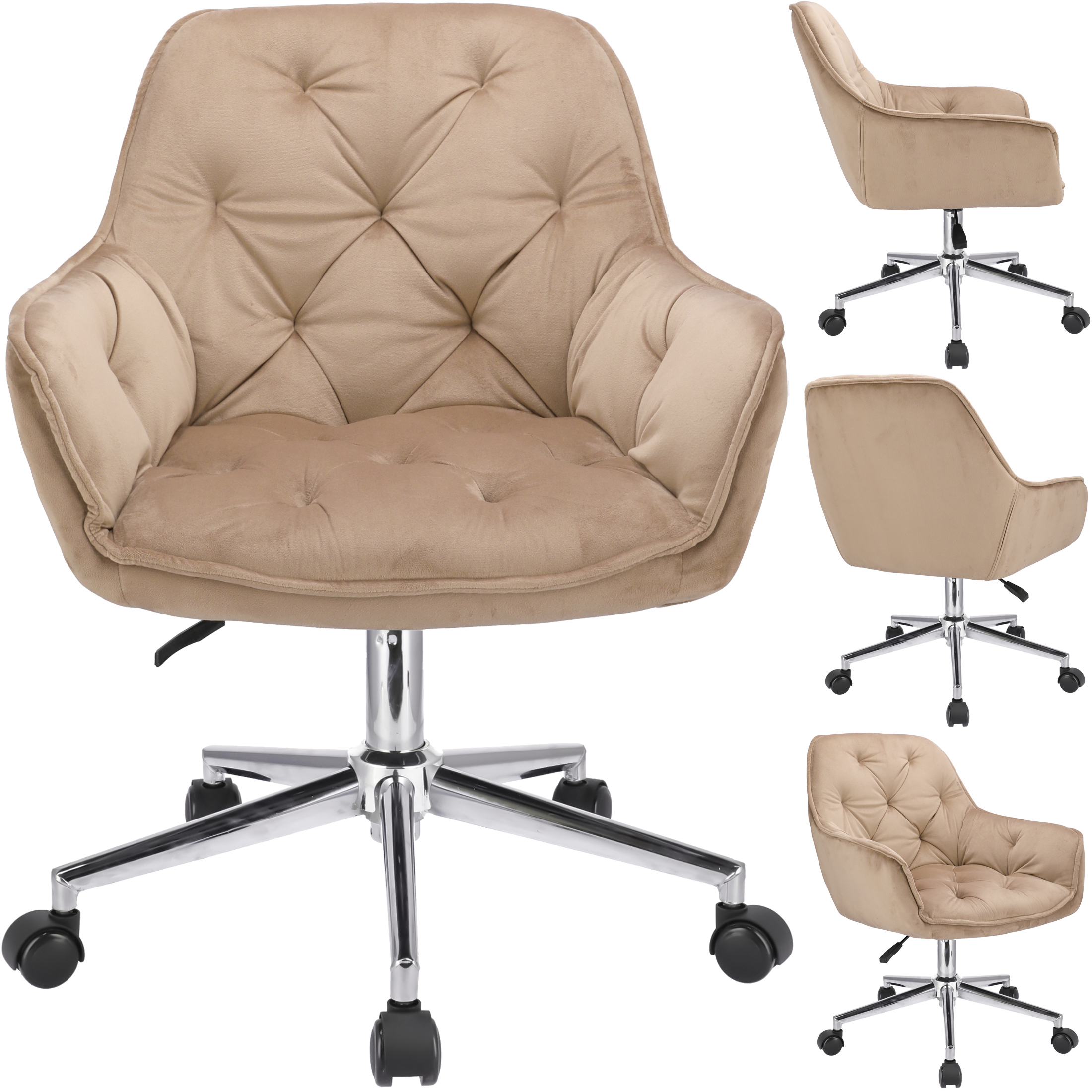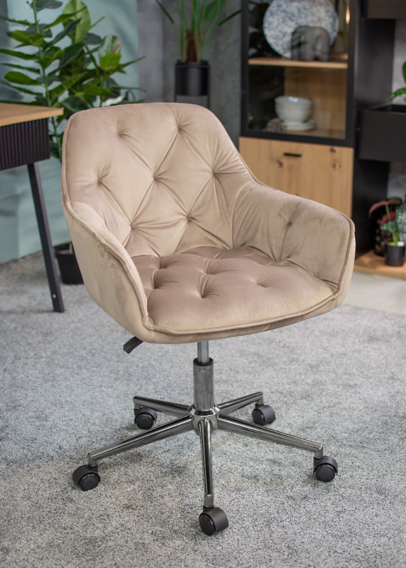 - Elegancki fotel biurowy obity miękkim welurem, łączący nowoczesny design z wyjątkowym komfortem. Regulacja wysokości i 360-stopniowy obrót zapewniają wygodę podczas pracy. Solidna podstawa na pięciu kółkach gwarantuj