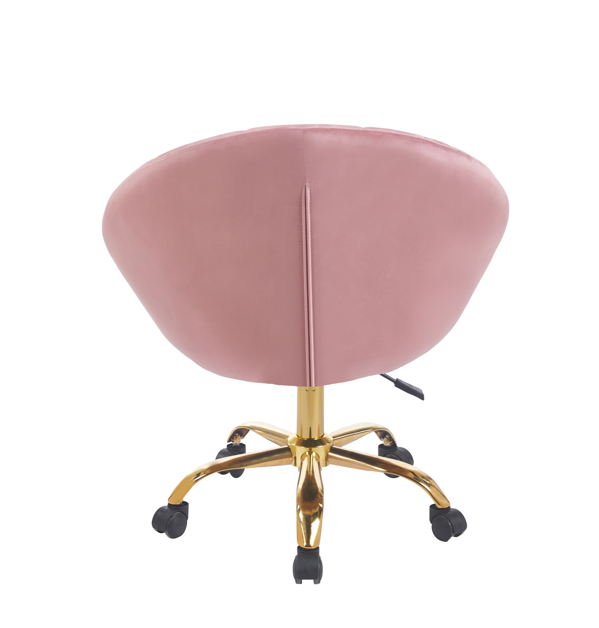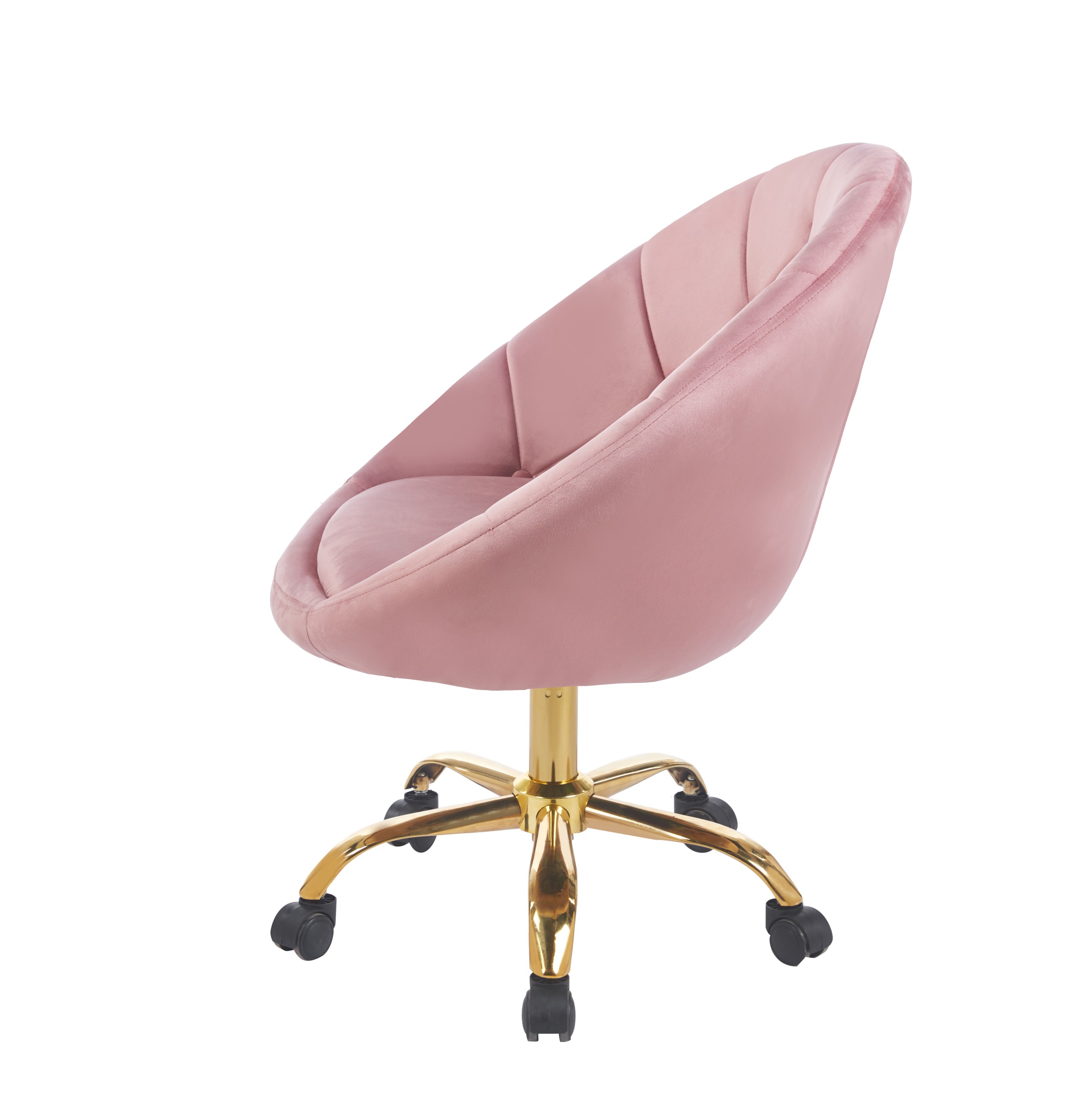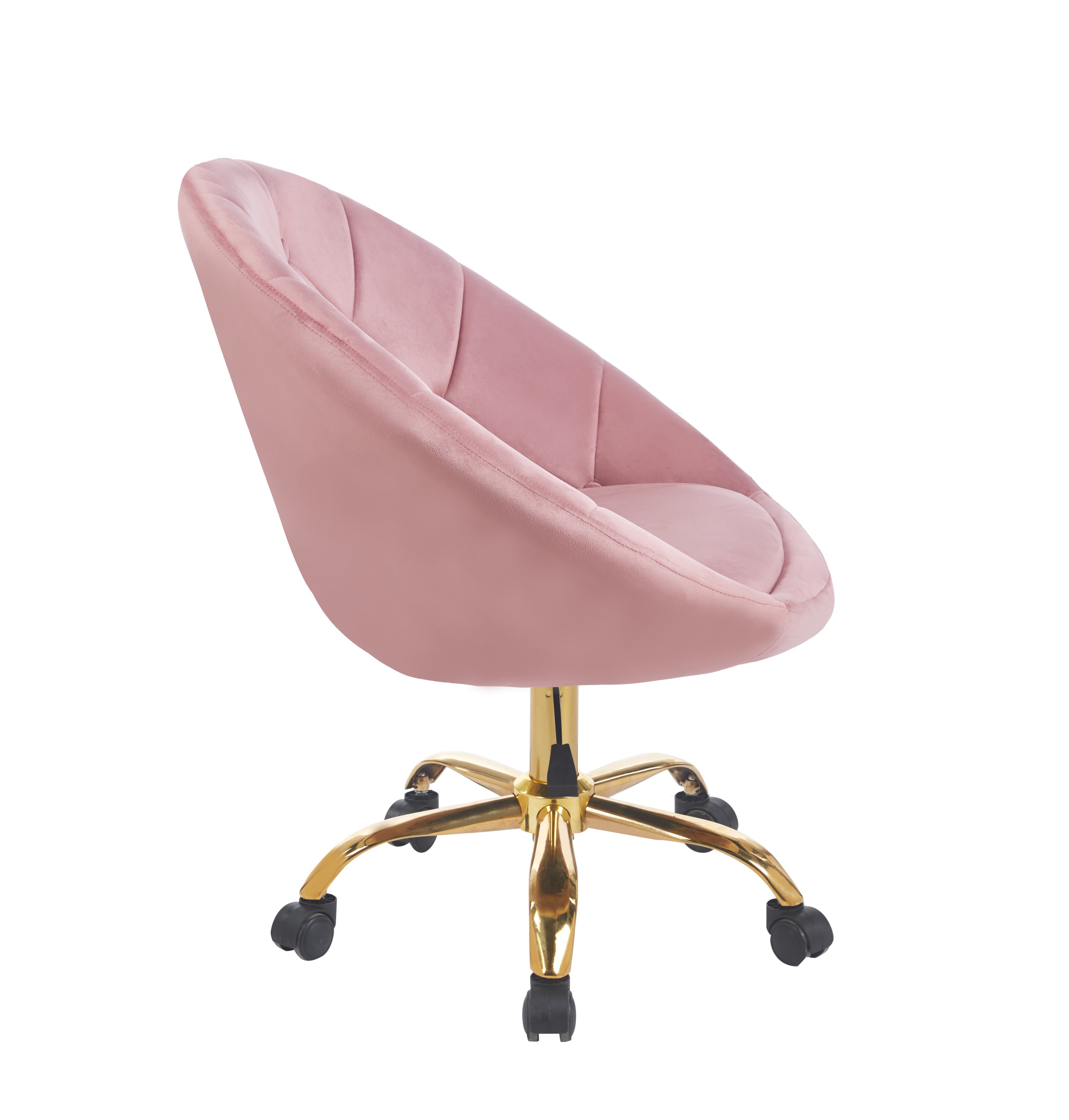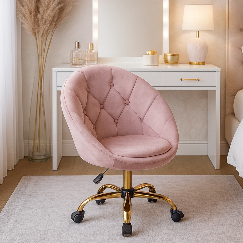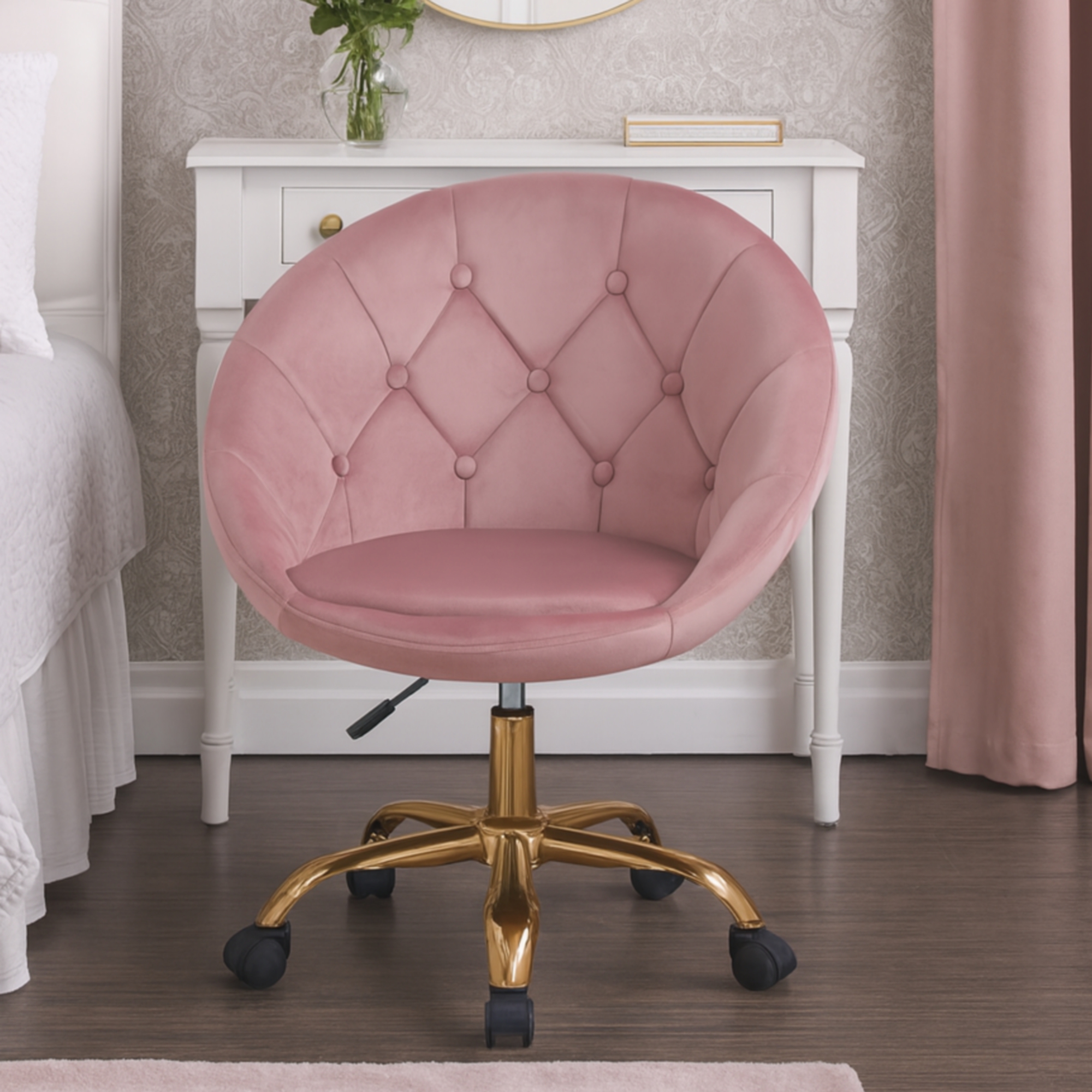 ➡️ Wyrafinowany design w połączeniu z nowoczesnością tworzą ten stylowy fotel. Obrotowy, na kółkach, wykonany z przyjemnego w dotyku weluru w klasycznym i uniwersalnym odcieniu różu, stanie się ozdobą każdego biura, toaletki, salonu kosmetycznego czy pokoju młodzieżowego.