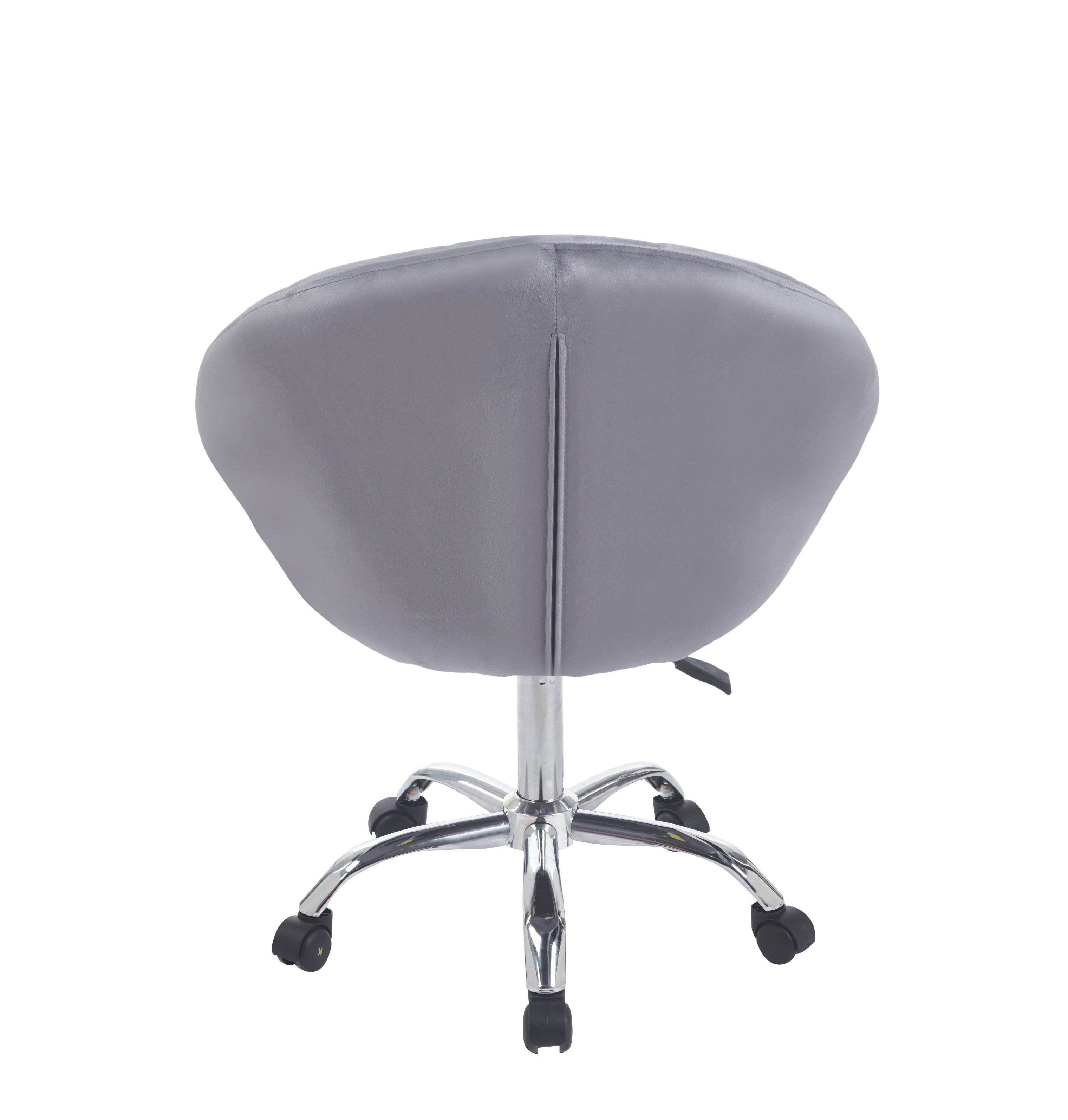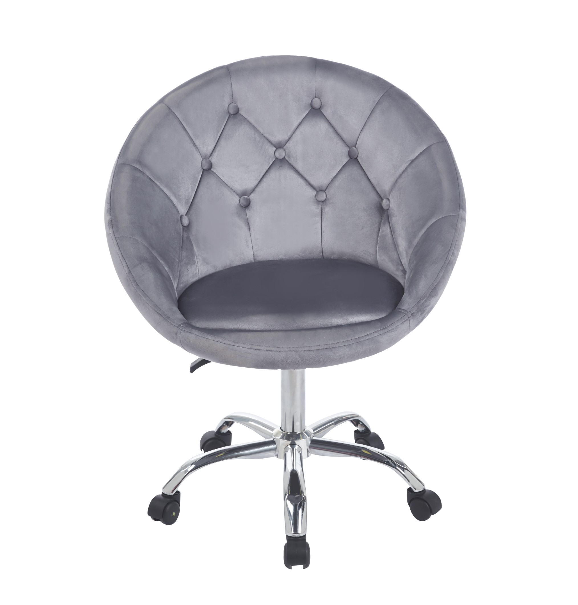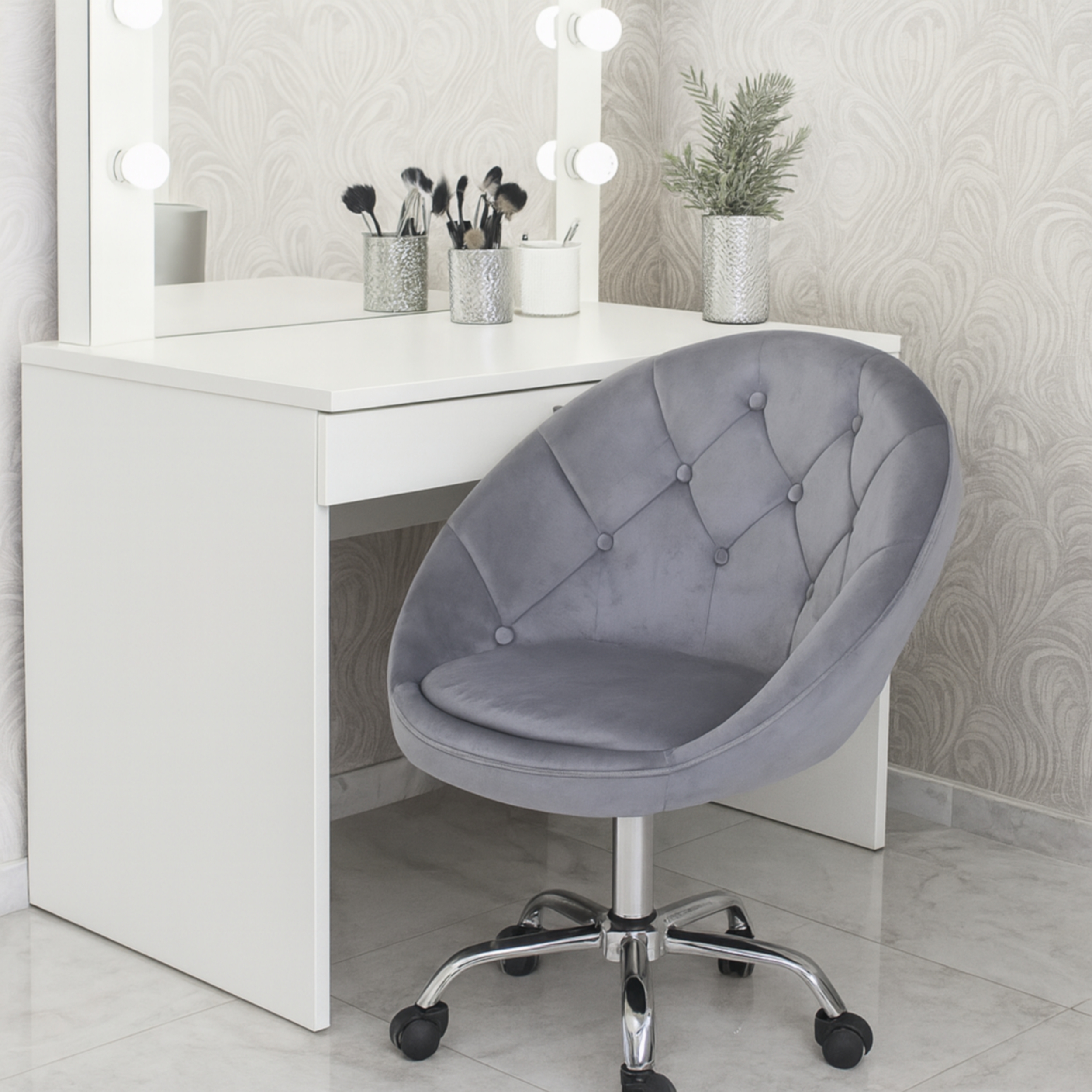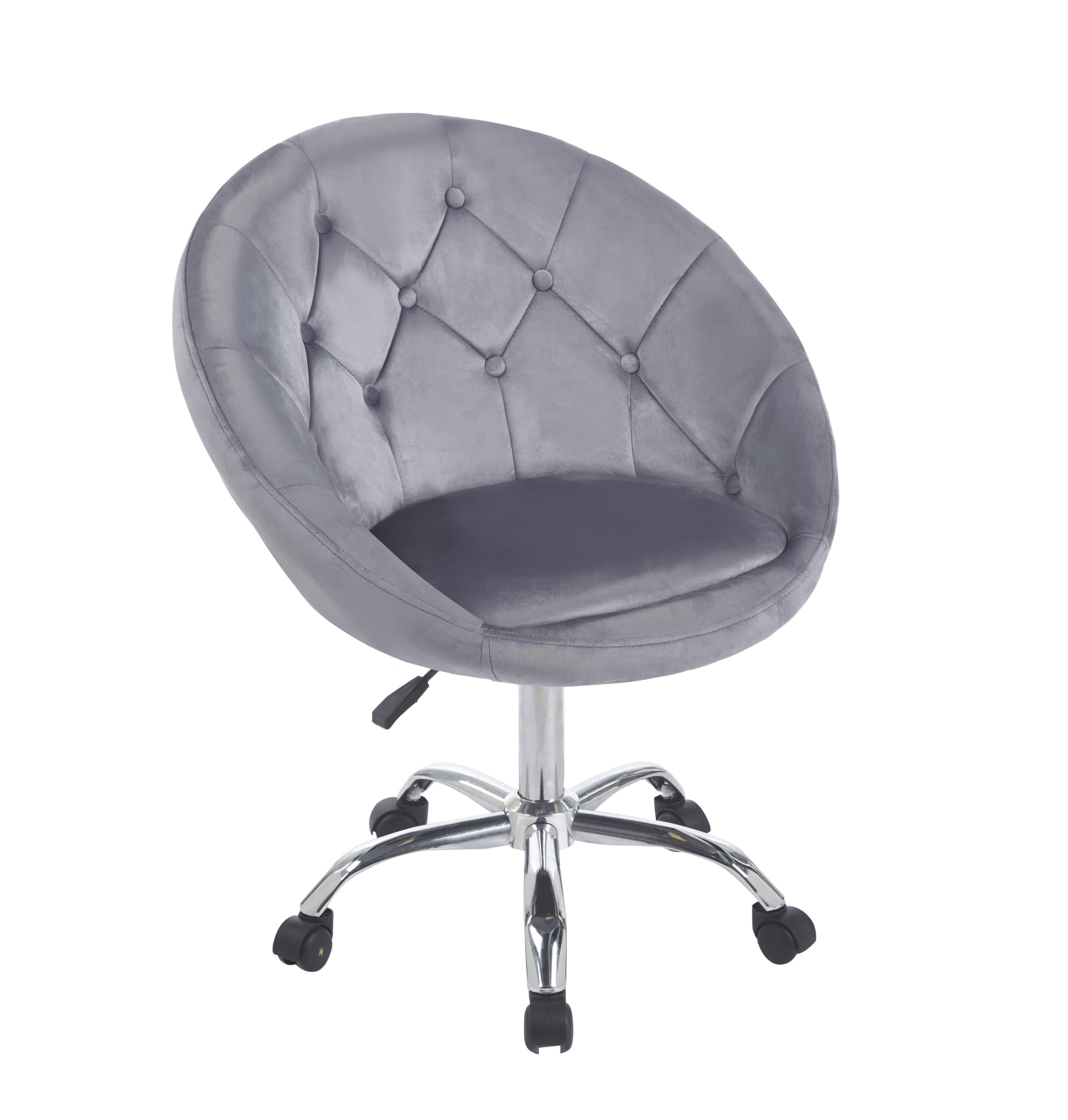 ➡️ Wyrafinowany design w połączeniu z nowoczesnością tworzą ten stylowy fotel. Obrotowy, na kółkach, wykonany z przyjemnego w dotyku weluru w klasycznym i uniwersalnym odcieniu szarości, stanie się ozdobą każdego biura, toaletki, salonu kosmetycznego czy pokoju młodzieżowego.