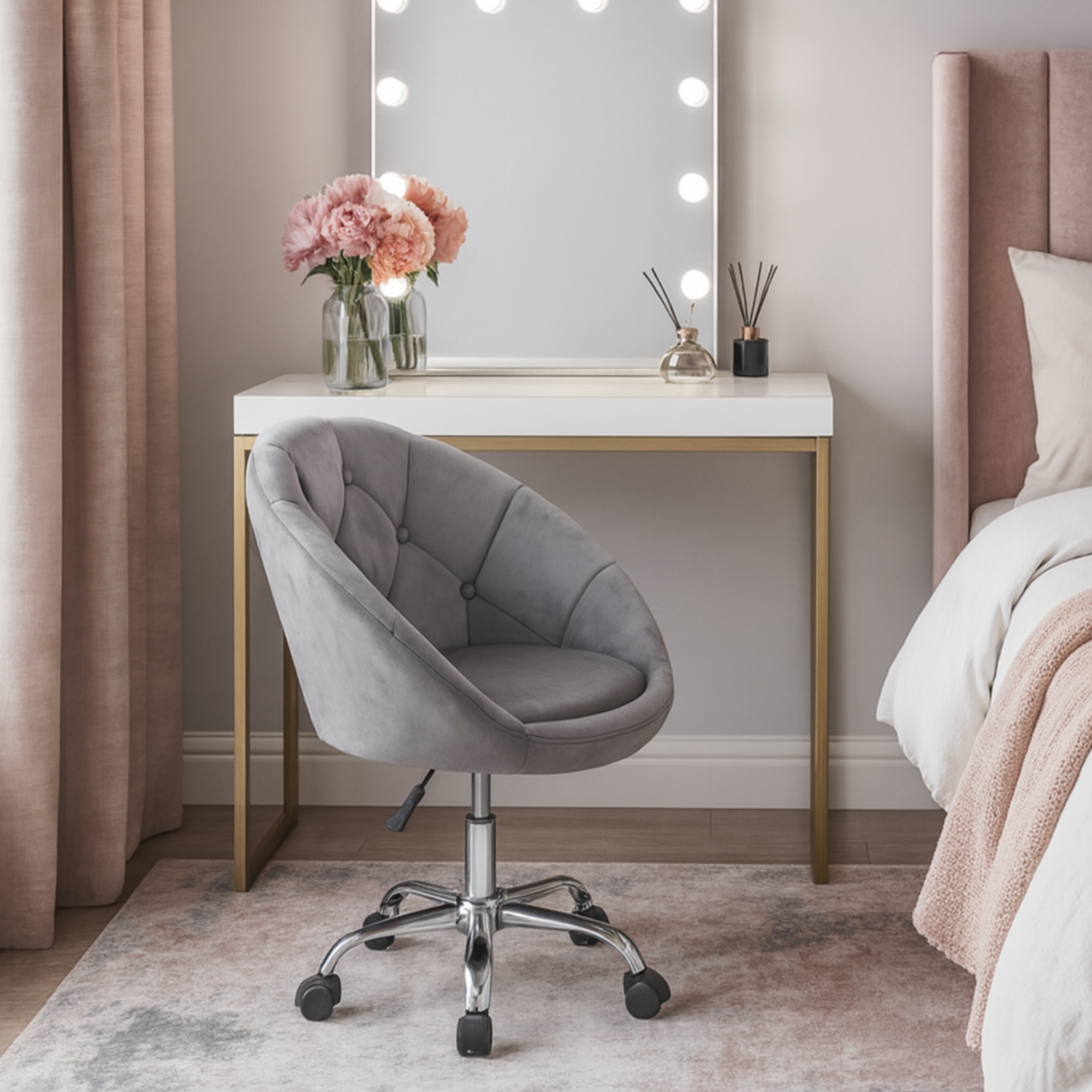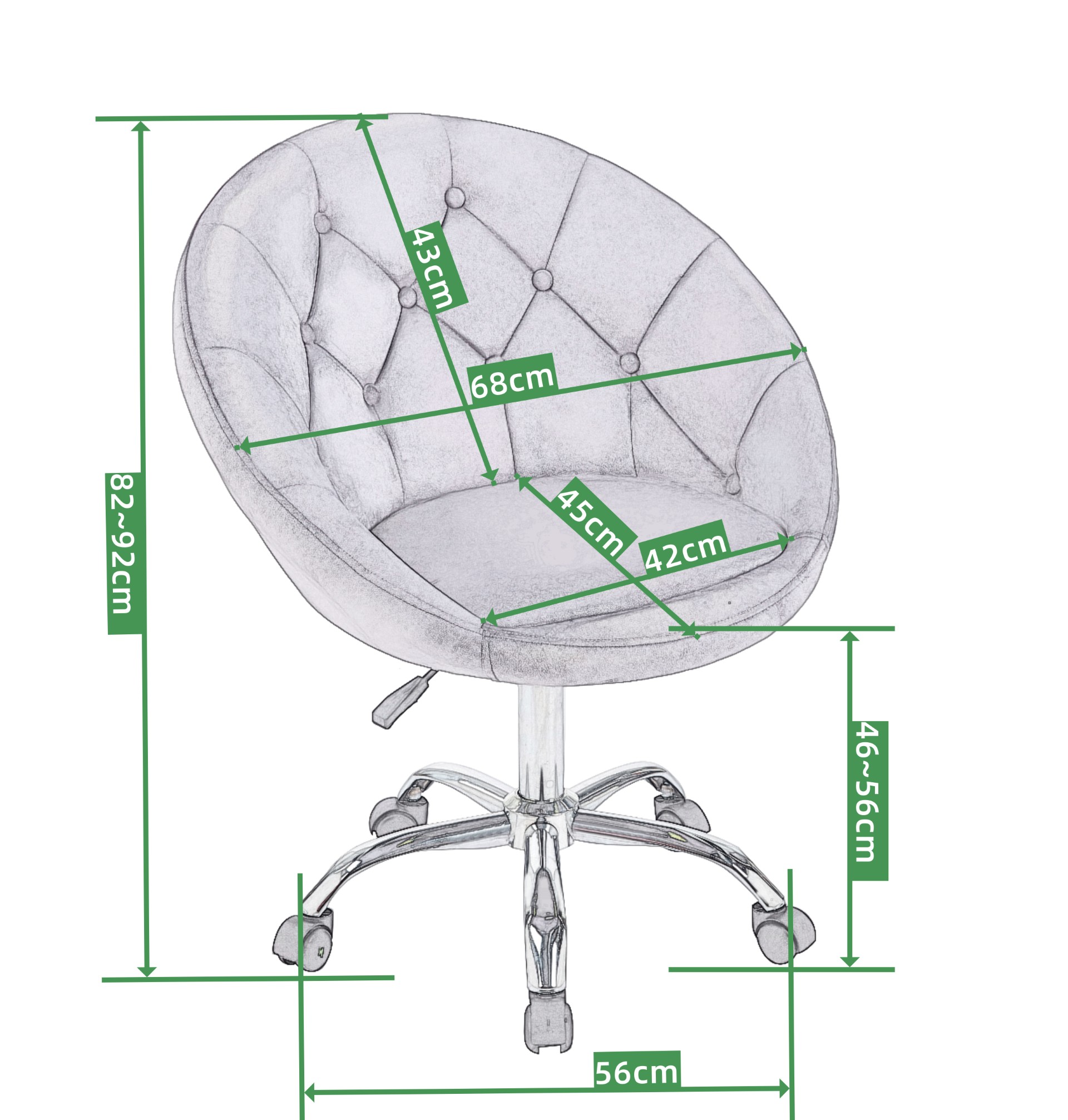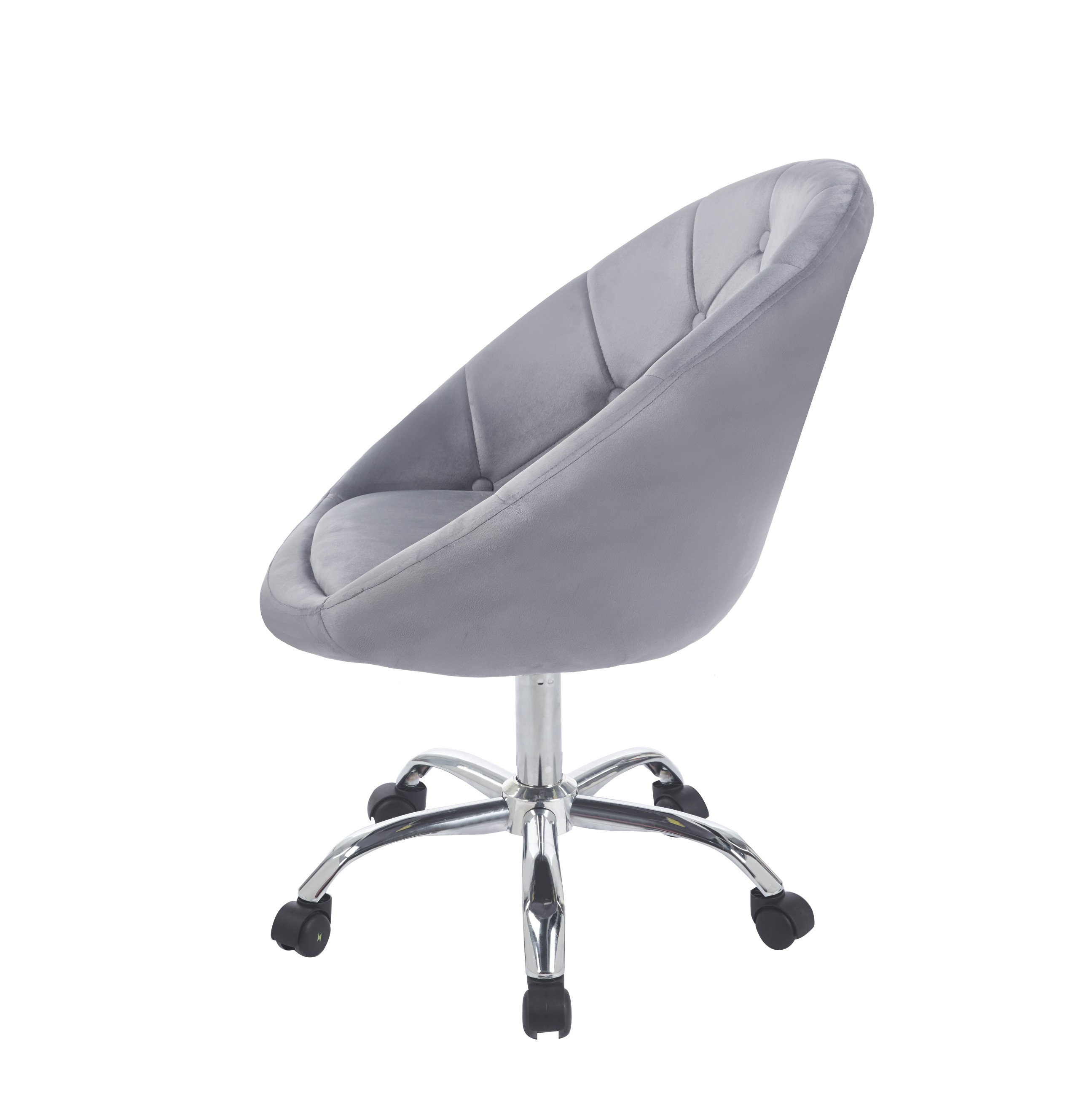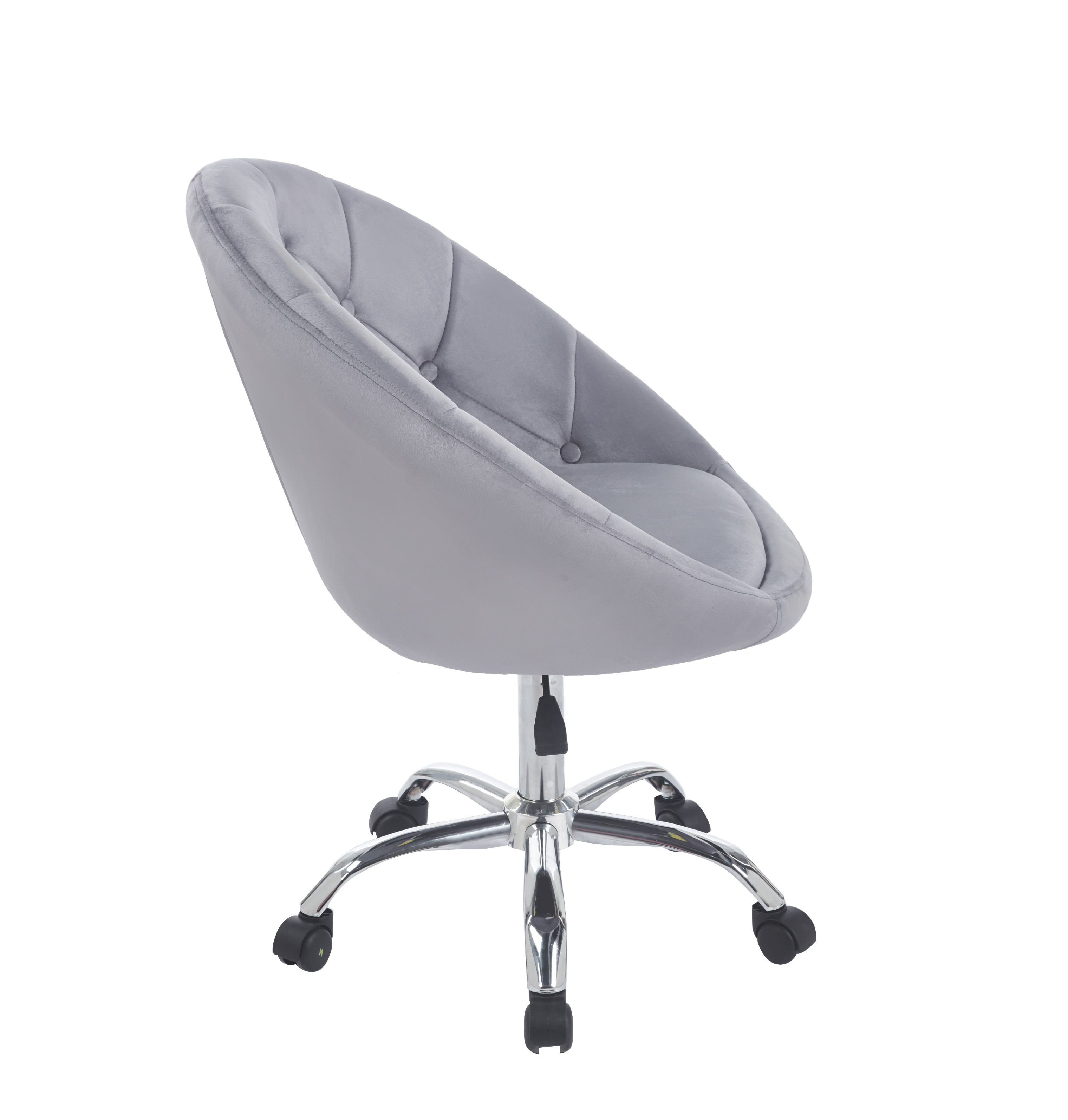 ➡️ Wyrafinowany design w połączeniu z nowoczesnością tworzą ten stylowy fotel. Obrotowy, na kółkach, wykonany z przyjemnego w dotyku weluru w klasycznym i uniwersalnym odcieniu szarości, stanie się ozdobą każdego biura, toaletki, salonu kosmetycznego czy pokoju młodzieżowego.