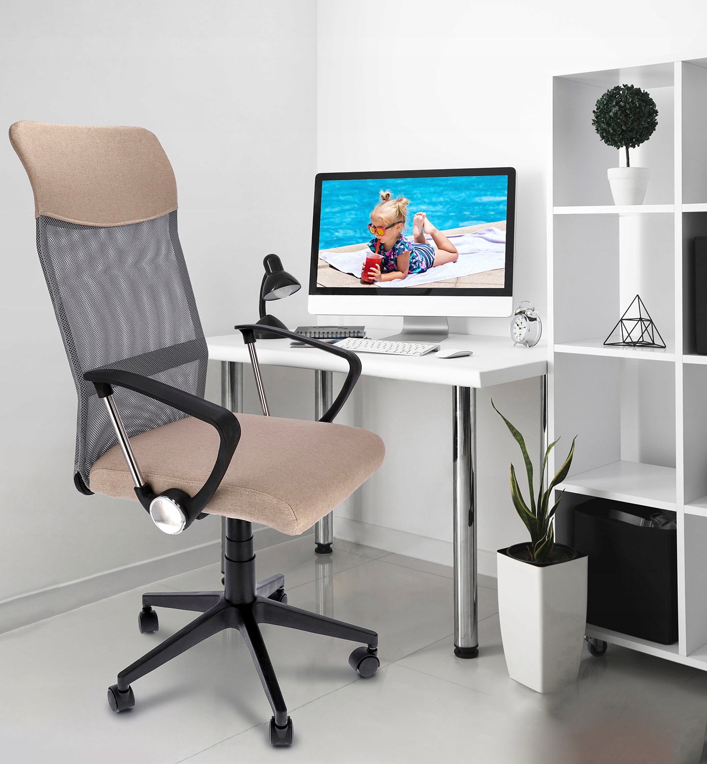 Wysokie, wyprofilowane oparcie z ergonomicznej siatki w połączeniu z eleganckim materiałem wygląda bardzo szykownie, a miękkie siedzisko zapewnia dużą wygodę. Pięcioramienna podstawa zakończona niewielkimi plastikowymi kółkami daje dużą stabilność, a siłownik pozwala dostosować wysokość siedzenia do wymaganych potrzeb.