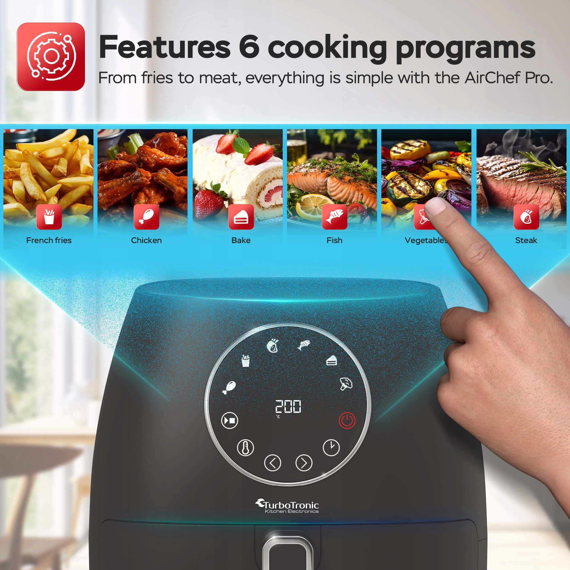 Wybierz jeden z 6 automatycznych programów i przygotuj frytki, steki, ciasta czy ryby jednym dotknięciem. Możesz także samemu dostosować temperaturę i czas smażenia według własnych potrzeb, co daje pełną kontrolę nad przygotowywanymi potrawami.