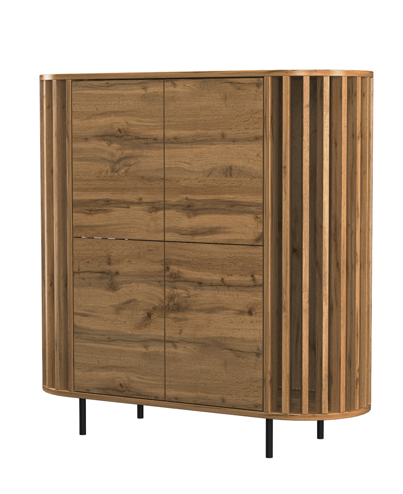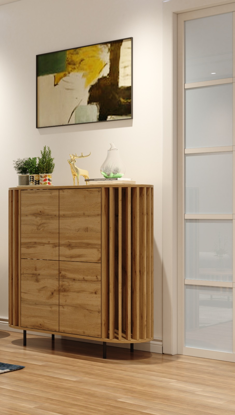 Pojemna czterodrzwiowa komoda wykonana z wysokiej jakości laminatu o przepięknym dekorze Wotan, ozdobiona niepowtarzalną formą. Jej zaokrąglenia dodają jej lekkości i uroku. Circle to połączenie funkcjonalności oraz kreatywności dzięki czemu Twój salon zyska najbardziej urokliwy charakter.