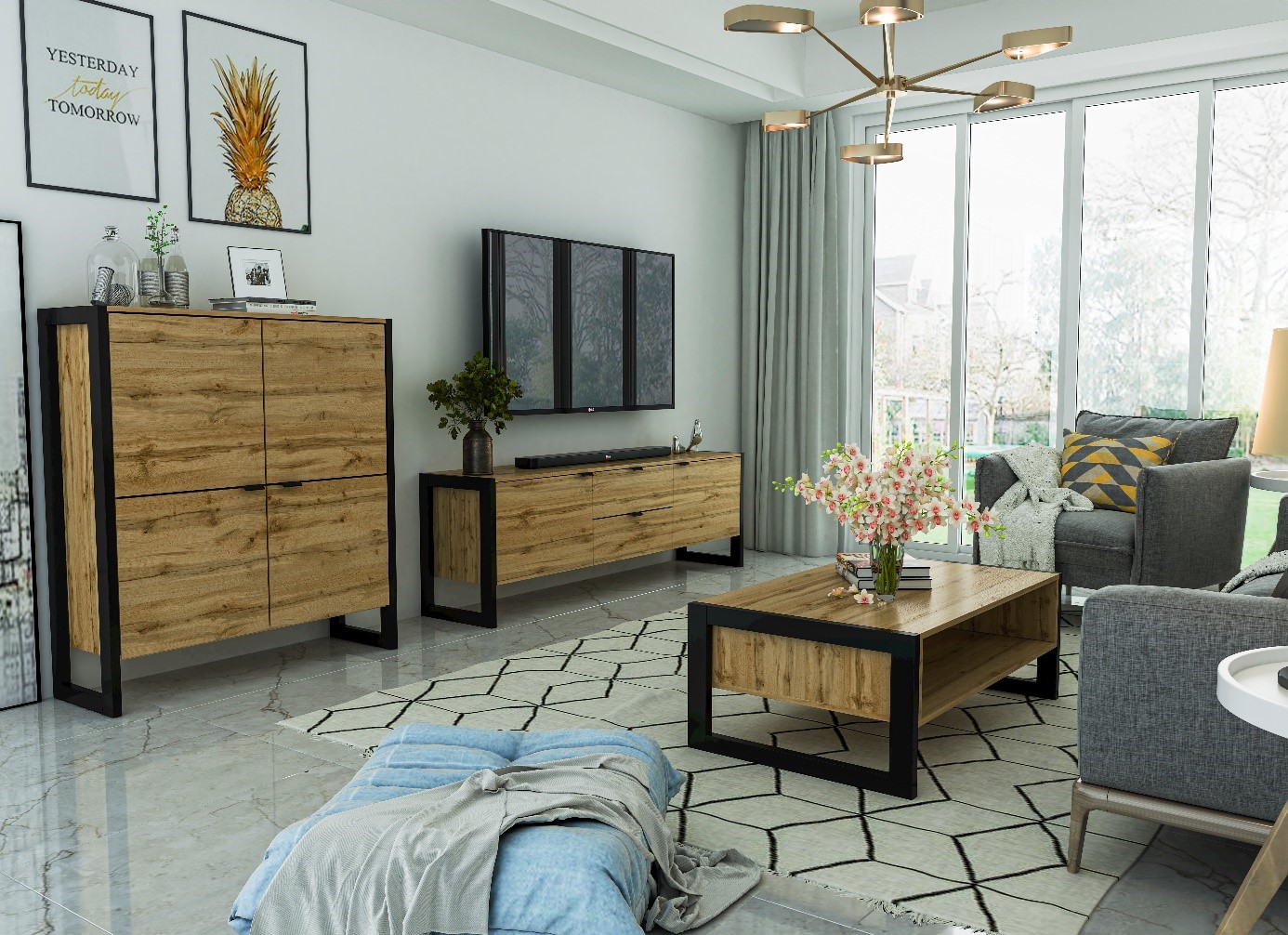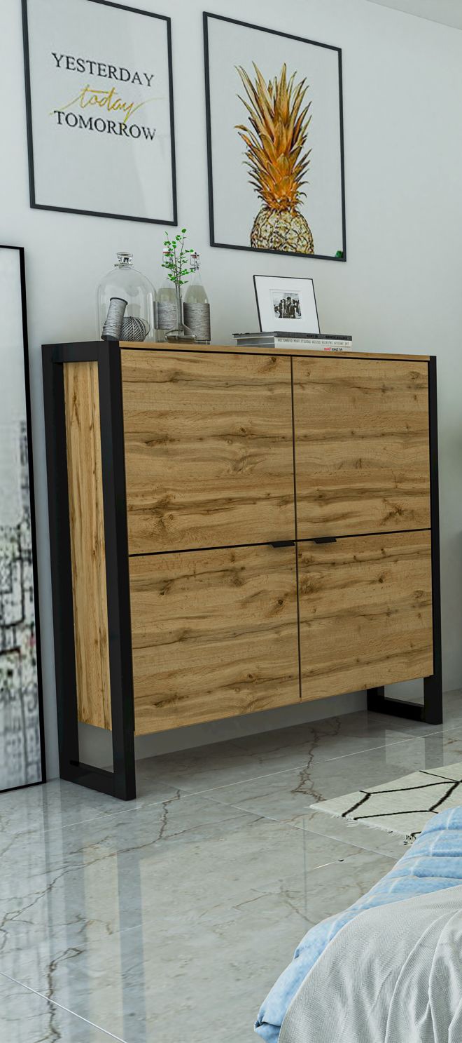 Komoda wykonana z laminatów o przepięknych współczesnych dekorach dąb wotan i czarny mat. Ze względu na swój prosty i nowoczesny styl wpisze się w wielu wnętrzach takich jak np loftowych ale nie tylko. Pojemna i praktyczna a jednocześnie jest świetnym miejscem do ekspozycji ulubionych przedmiotow. Znajdzie swoje zastosowanie zarówno w salonie jak również w sypialni czy jadalni.