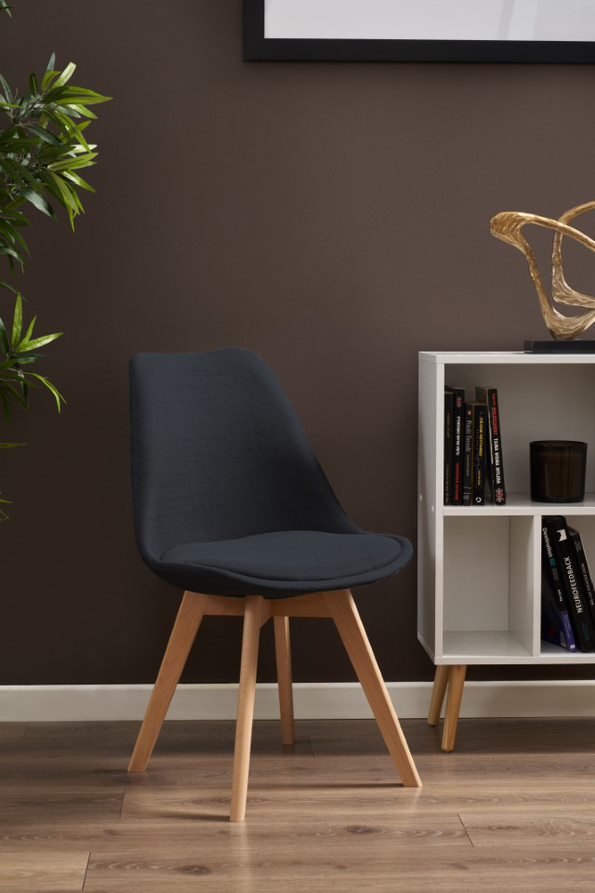 Posiada idealnie wyprofilowane oparcie pokryte tkaniną, które w połączeniu z miękką poduszką umieszczoną na siedzisku zapewnia dużą wygodę. Drewniane nogi wykonane z buku o jego jasnym odcieniu zapewnianą stabilność oraz wytrzymałość. Krzesło jest bardzo praktyczne i funkcjonalne.