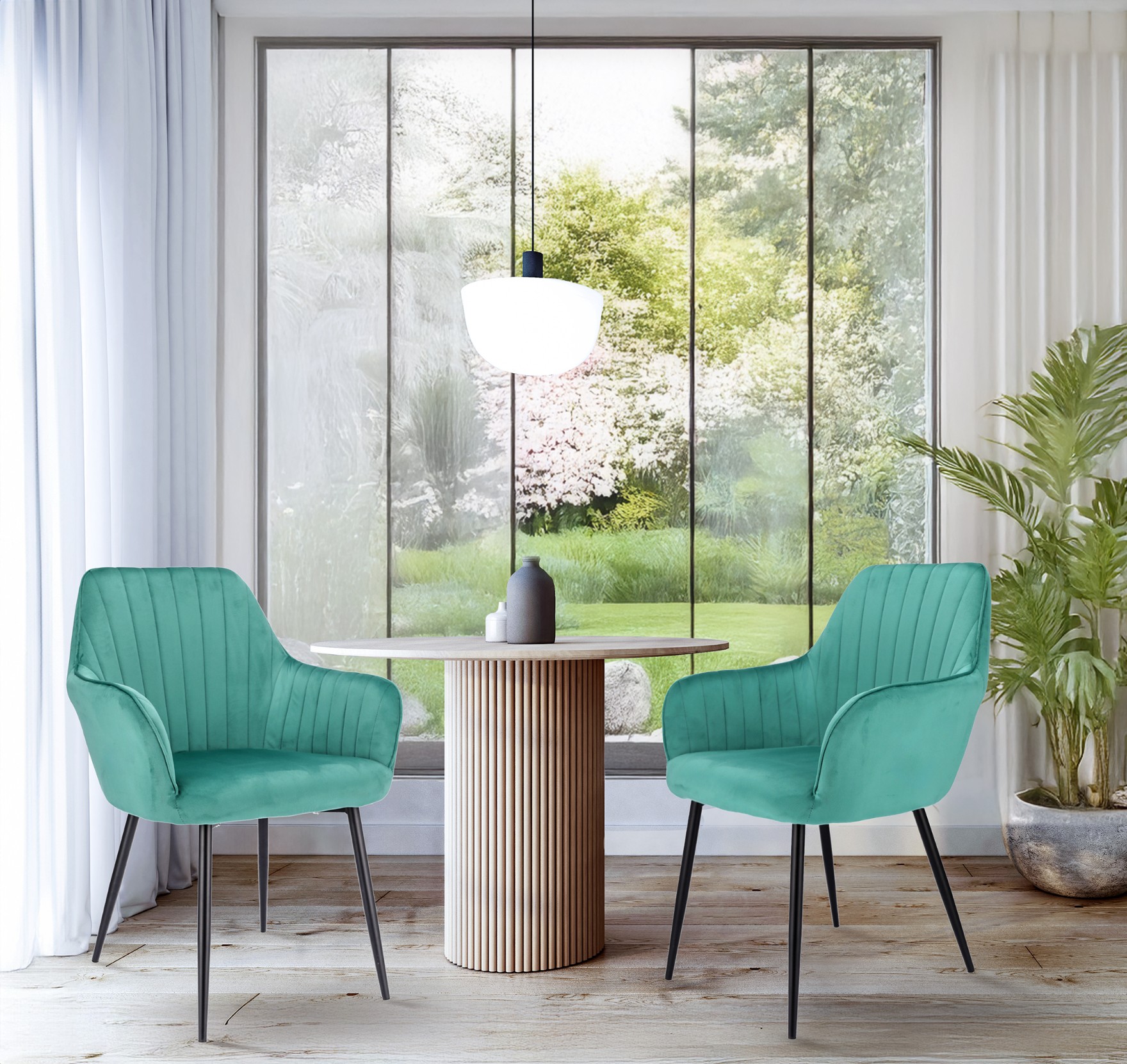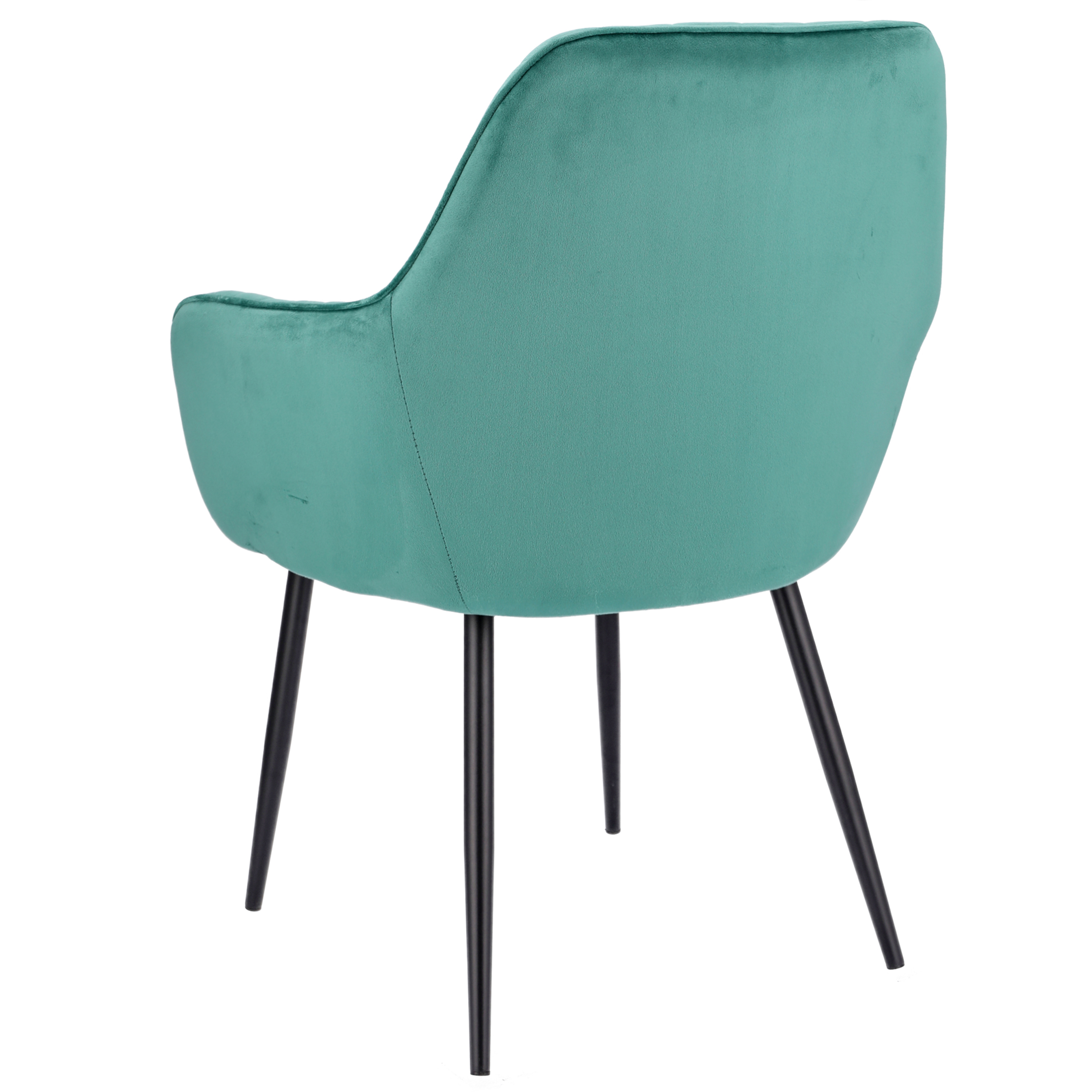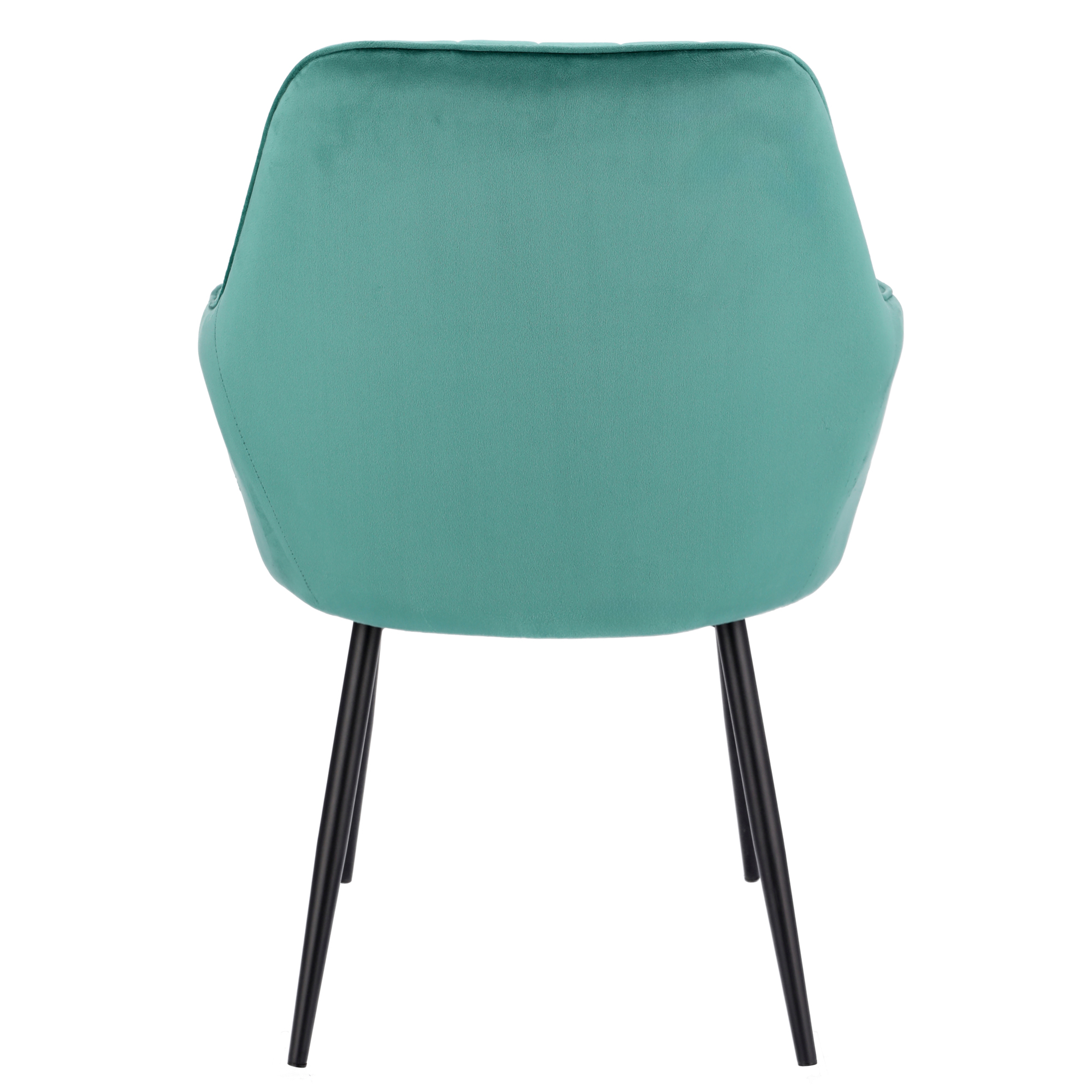 ➡️ Solidne, welurowe krzesło wyposażone zostało w miękkie siedzisko oraz wysokie oparcie z ozdobnymi pikowaniami. Całość wygląda lekko za sprawą smukłych czarnych nóżek, które nadają wizualnej lekkości, a zarazem zapewniają idealną stabilność. Wysokość oparcia, podłokietniki oraz jego miękkość sprawia, że fotel jest niesamowicie wygodny.