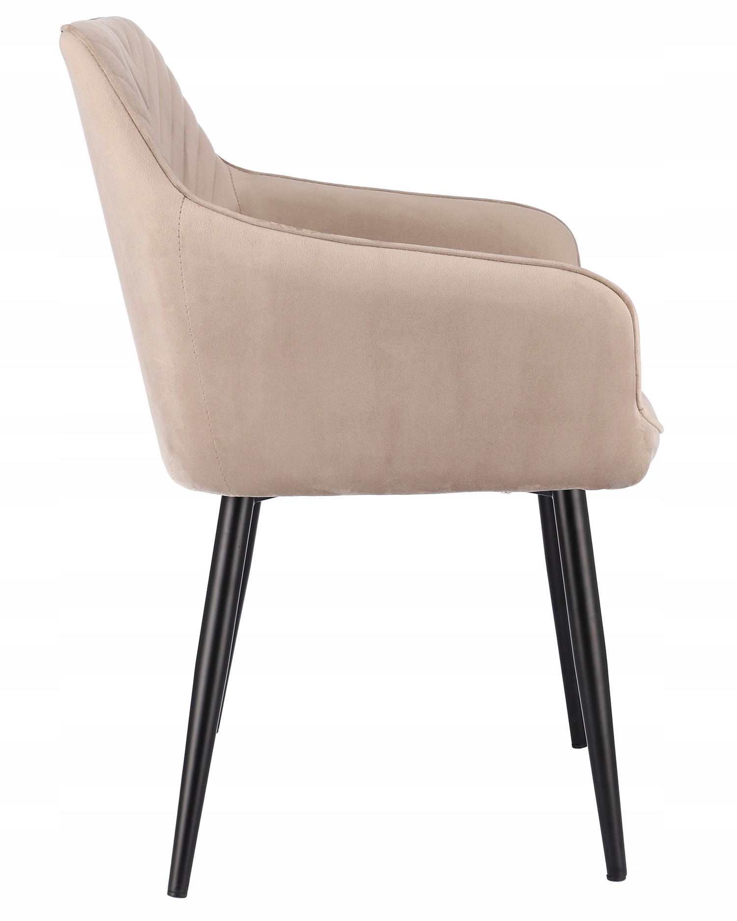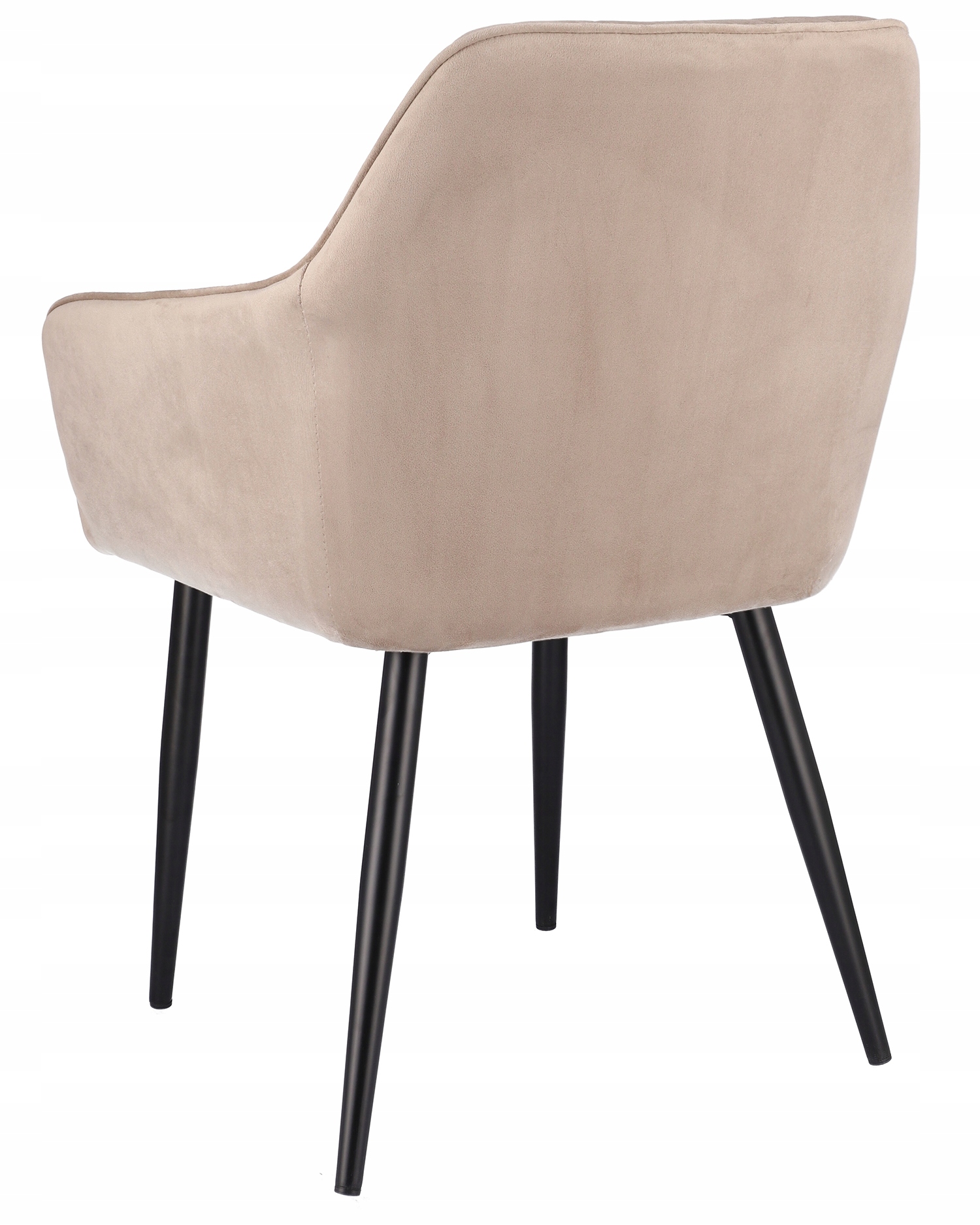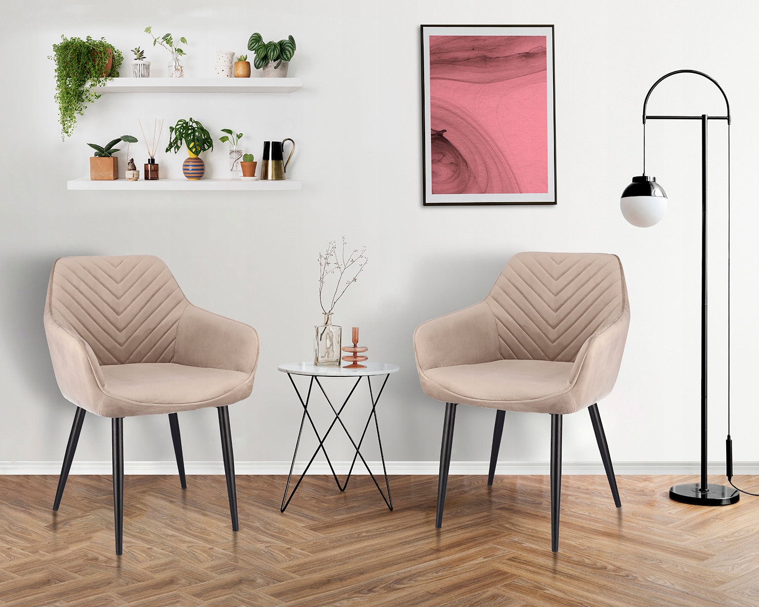 ➡️ Solidne, welurowe krzesło wyposażone zostało w miękkie siedzisko oraz wysokie oparcie z ozdobnymi pikowaniami we wzór jodełki. Całość wygląda lekko za sprawą smukłych czarnych nóżek, które nadają wizualnej lekkości, a zarazem zapewniają idealną stabilność.