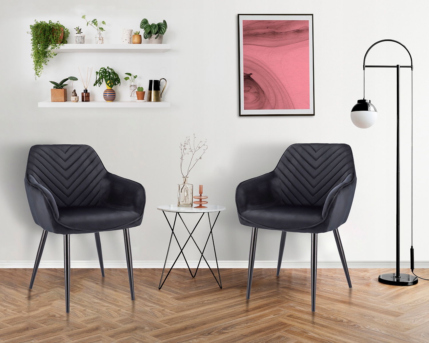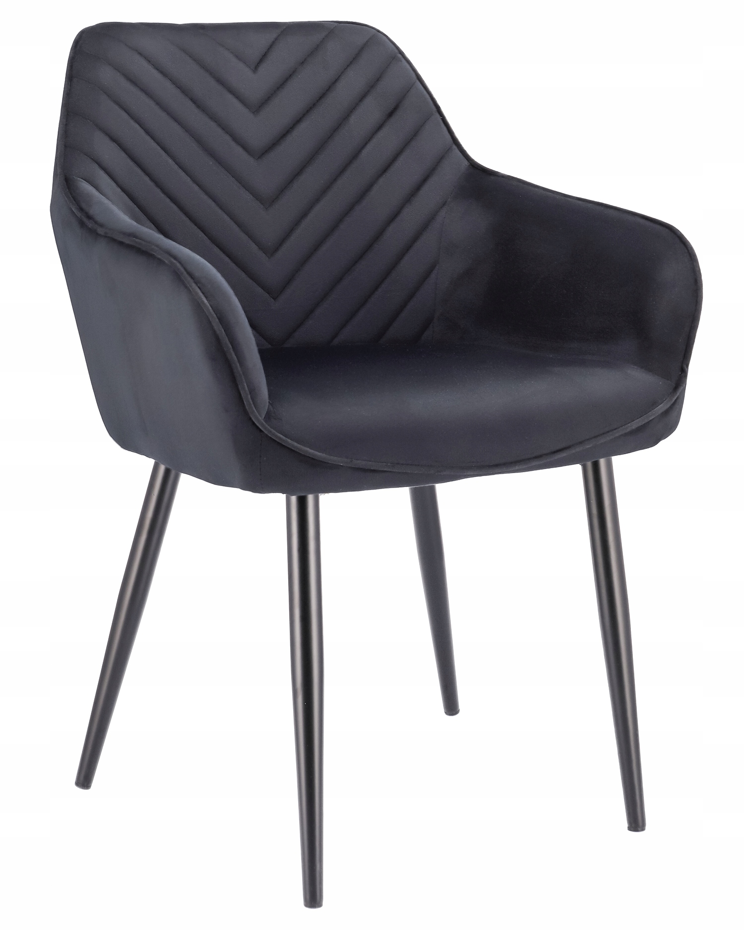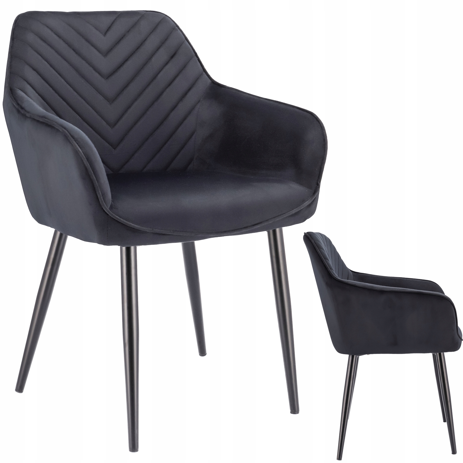 ➡️ Solidne, welurowe krzesło wyposażone zostało w miękkie siedzisko oraz wysokie oparcie z ozdobnymi pikowaniami we wzór jodełki. Całość wygląda lekko za sprawą smukłych czarnych nóżek, które nadają wizualnej lekkości, a zarazem zapewniają idealną stabilność.