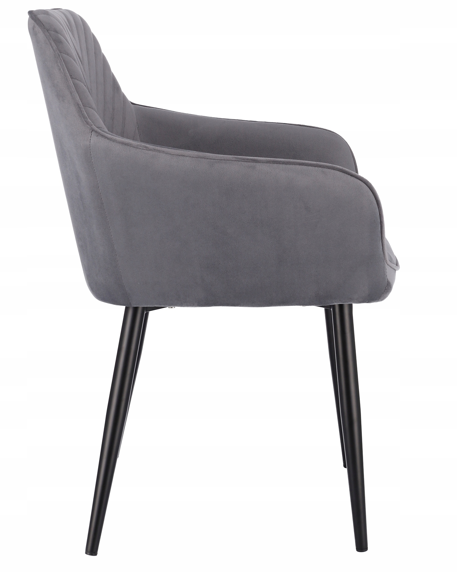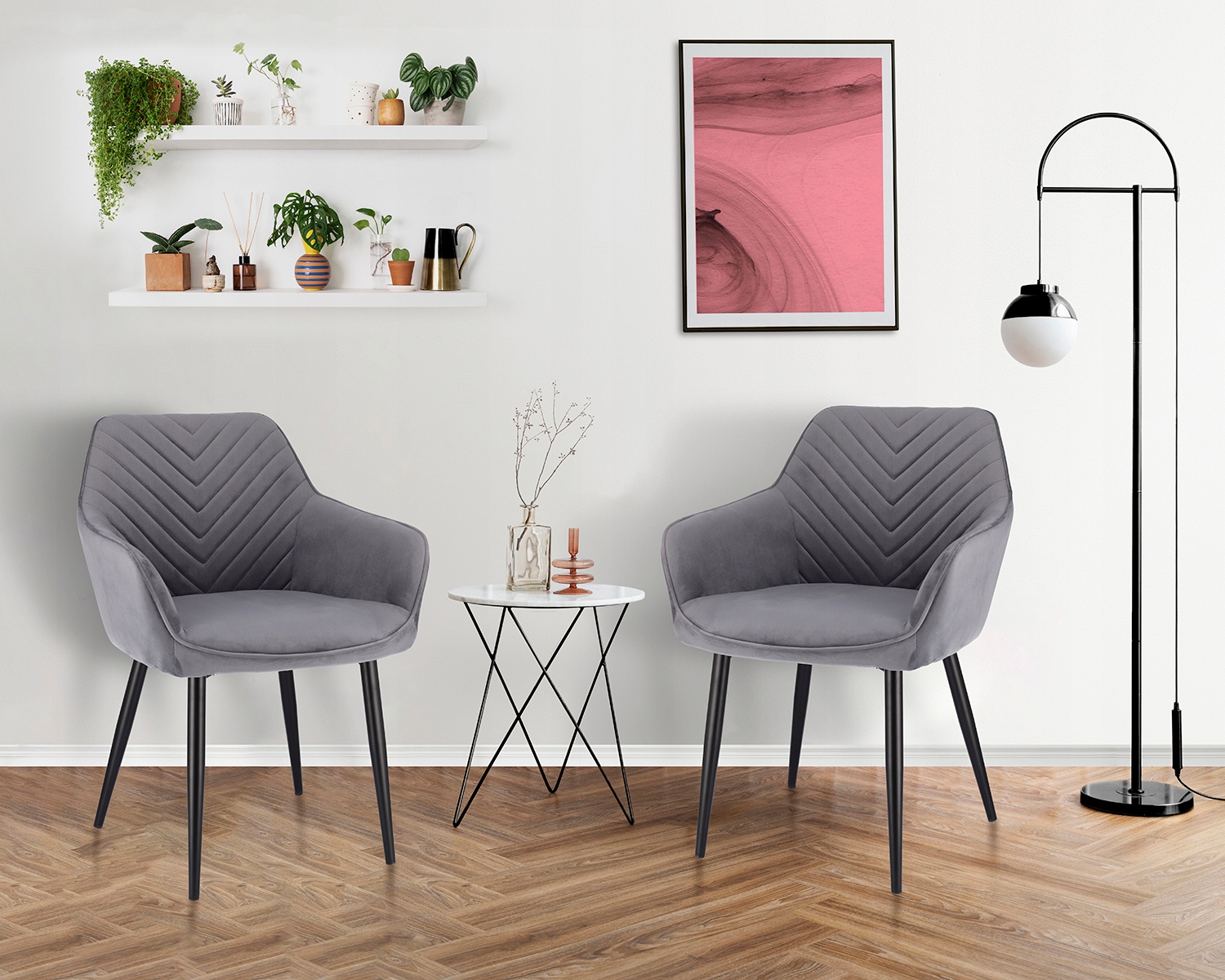 ➡️ Solidne, welurowe krzesło wyposażone zostało w miękkie siedzisko oraz wysokie oparcie z ozdobnymi pikowaniami we wzór jodełki. Całość wygląda lekko za sprawą smukłych czarnych nóżek, które nadają wizualnej lekkości, a zarazem zapewniają idealną stabilność.