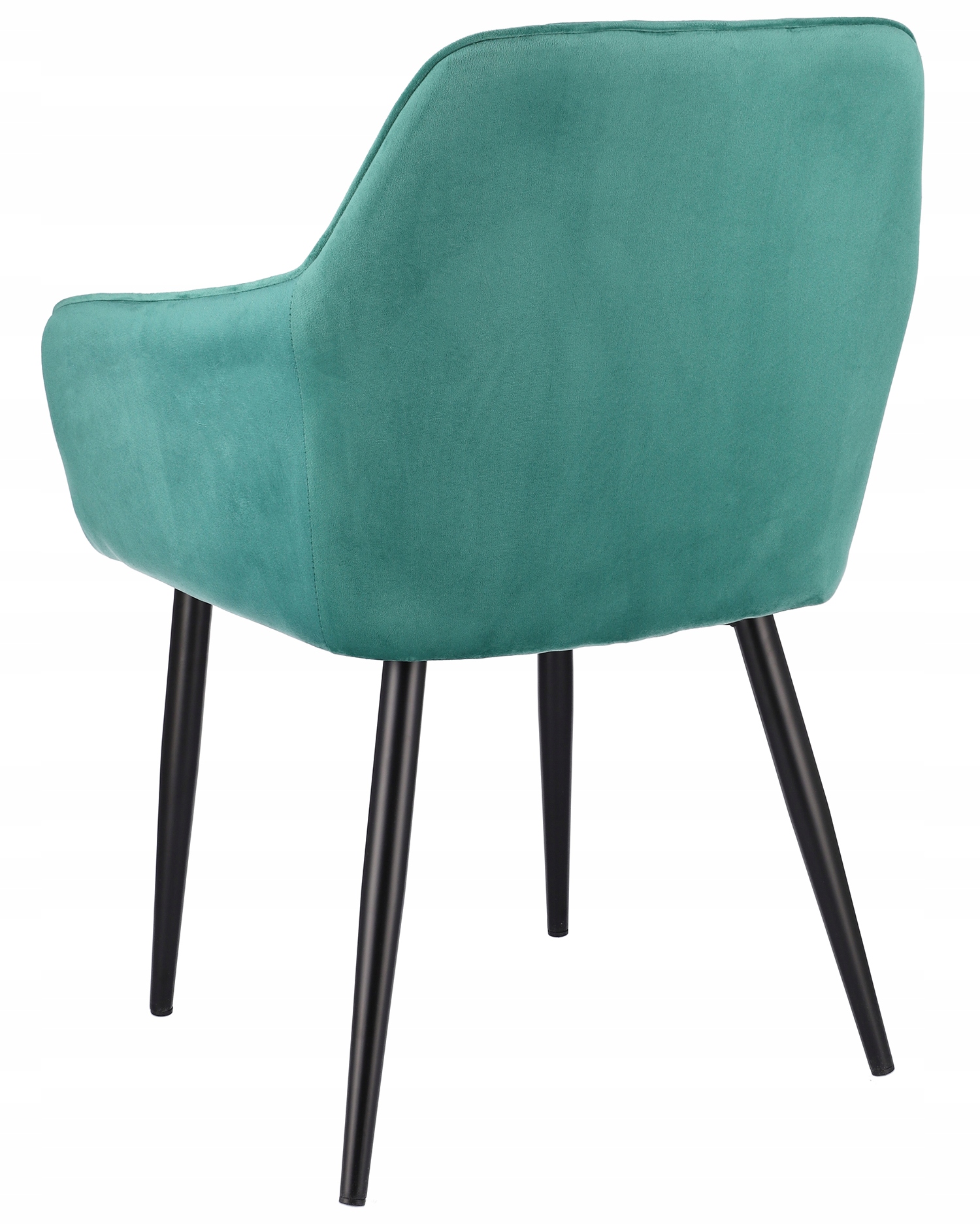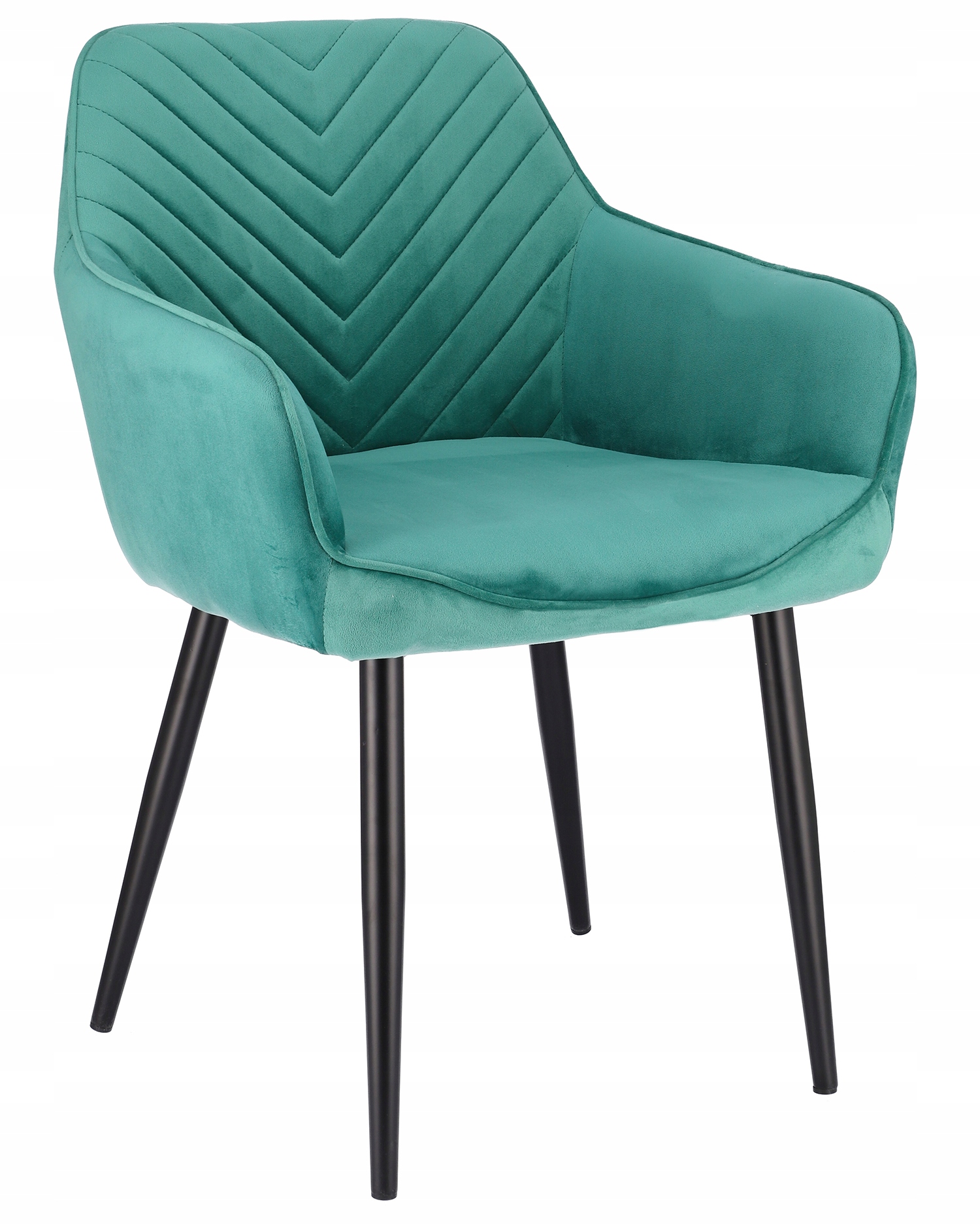 ➡️ Solidne, welurowe krzesło wyposażone zostało w miękkie siedzisko oraz wysokie oparcie z ozdobnymi pikowaniami we wzór jodełki. Całość wygląda lekko za sprawą smukłych czarnych nóżek, które nadają wizualnej lekkości, a zarazem zapewniają idealną stabilność.