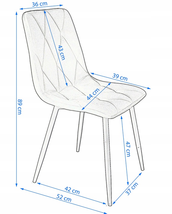 - Krzesło tapicerowane jest welurem, a po wewnętrznej stronie pikowane regularnymi przeszyciami w romby. Wysokie i smukłe nóżki w czar