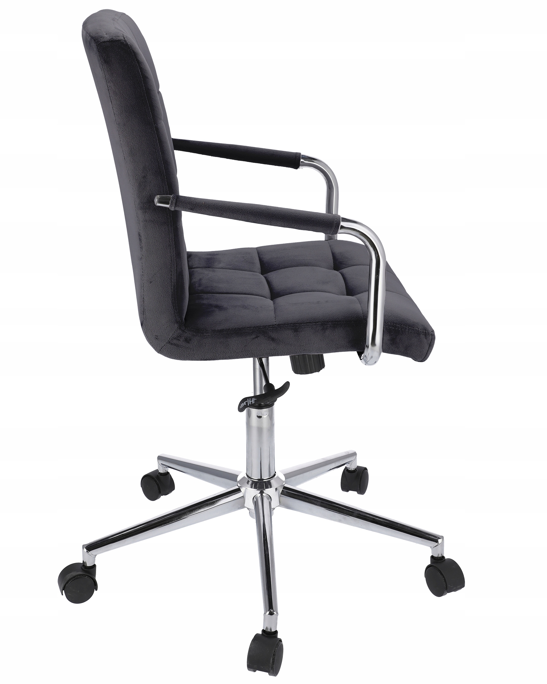 - Krzesło posiada tapicerowane welurem siedzisko z pikowaniem w kwadraty. Pięcioramienna podstawa zakończona niewielkimi kółkami d