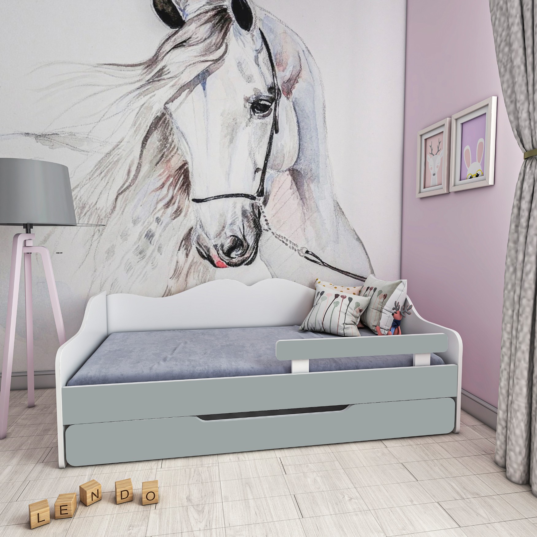 - Łóżko dziecięce w kolorze biało-szarym