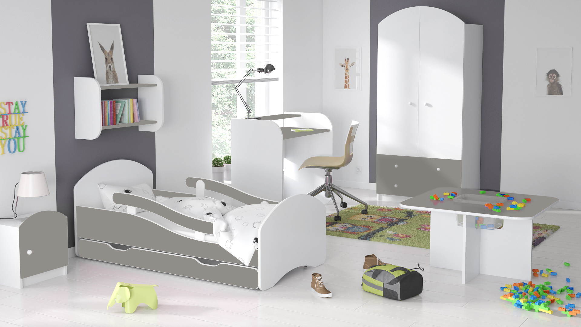 - Dwustronne łóżko dziecięce w kolorze biało-szarym