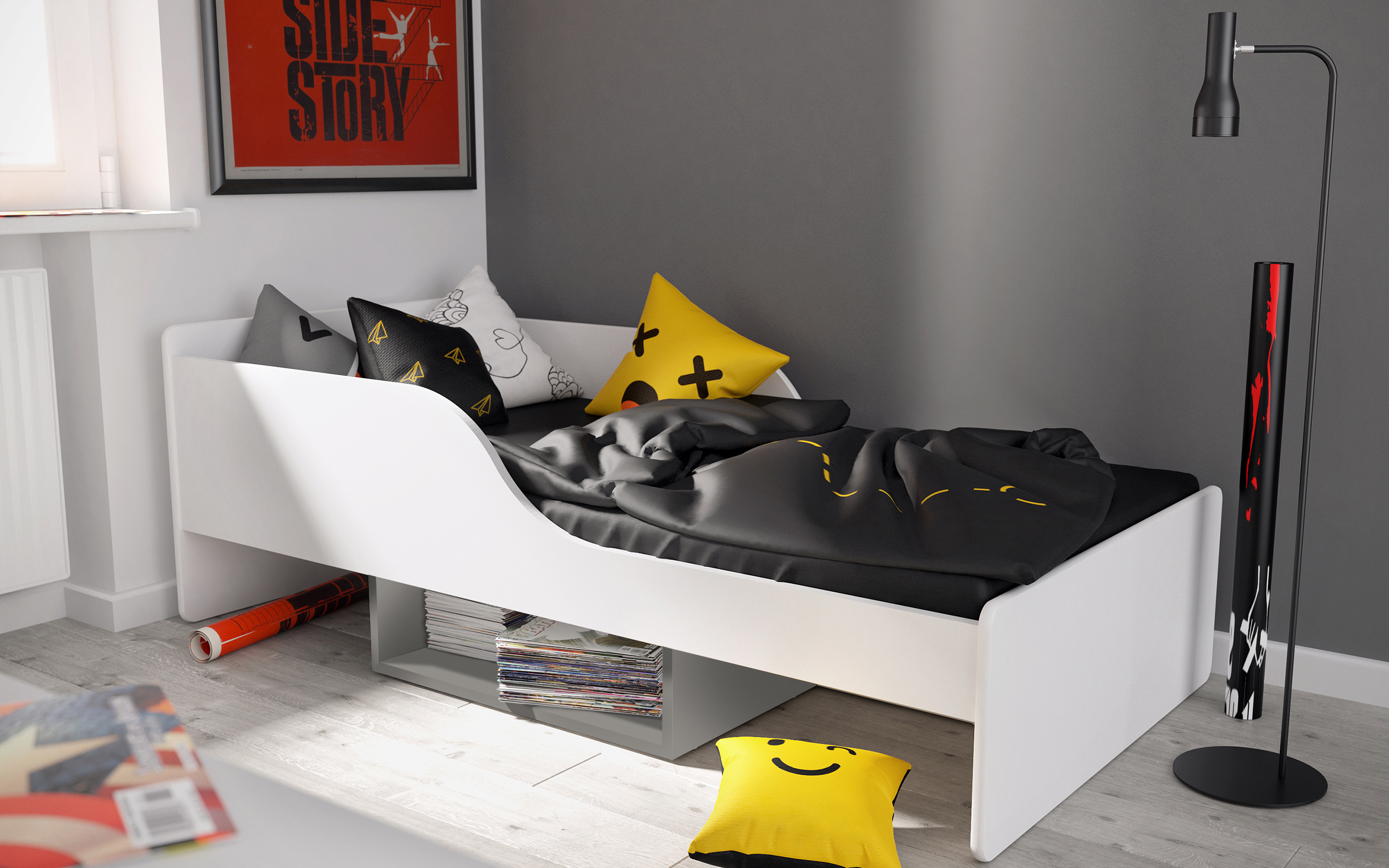 - Półkę pod łóżkiem w kolorze szarym.