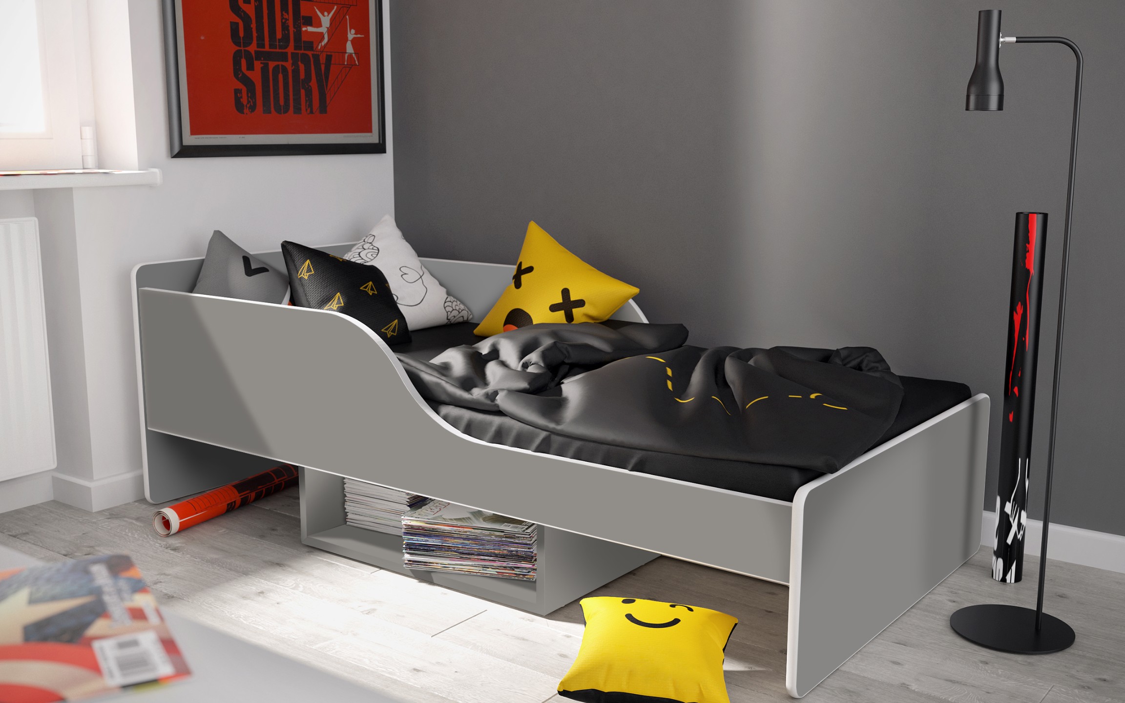 - Dwustronne łóżko dziecięce w kolorze szarym.