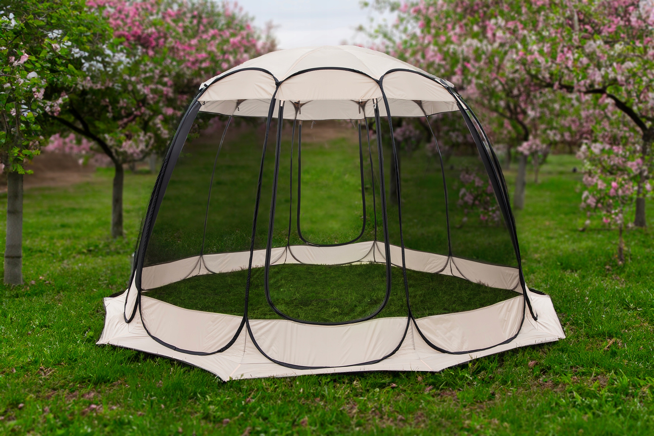 Transparentne i beżowe elementy konstrukcyjne dodają namiotowi lekkości i elegancji, co sprawia, że będzie on pasować do każdego ogrodu.