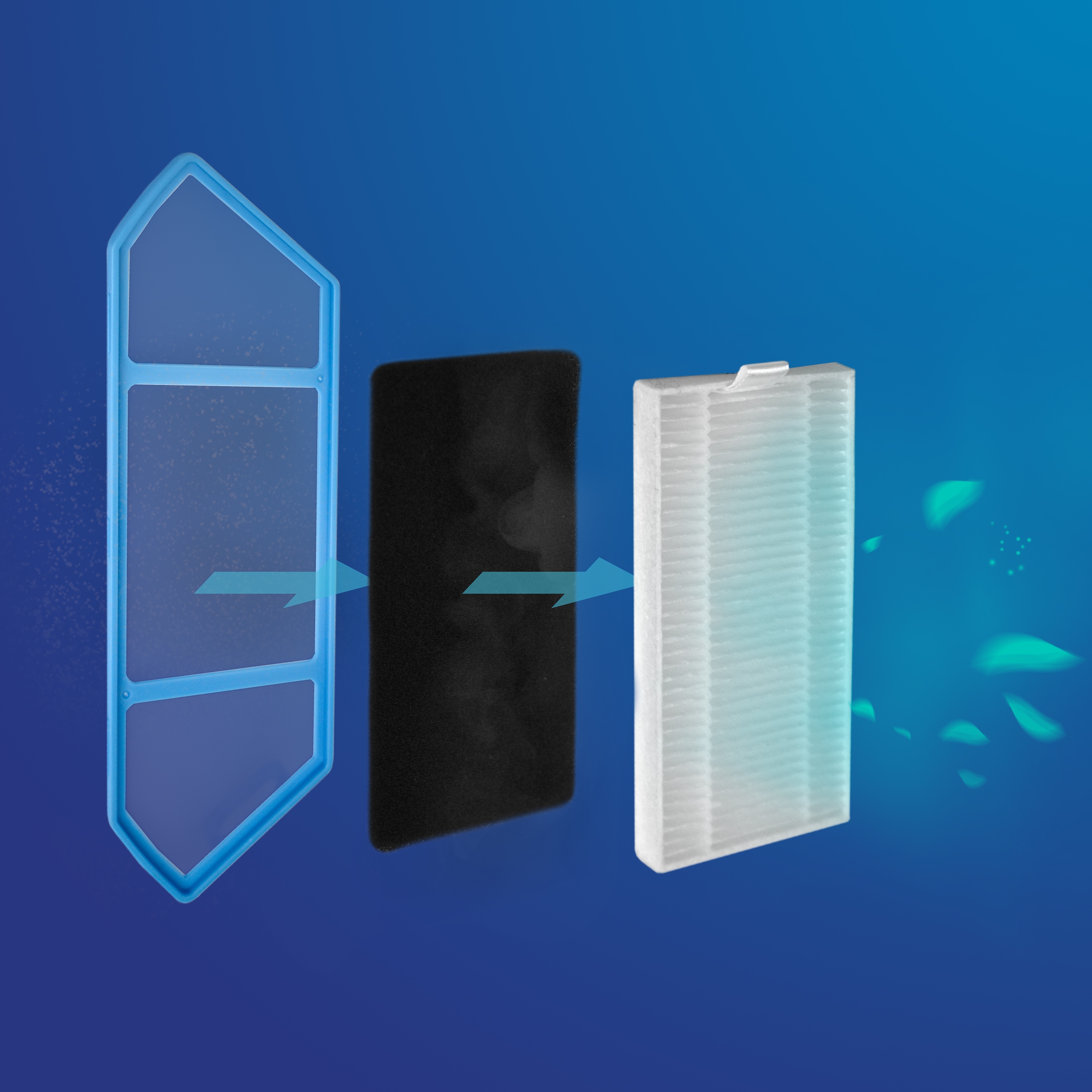 - 3 stopniowy system filtracji powietrza: wstępny, gąbkowy i HEPA