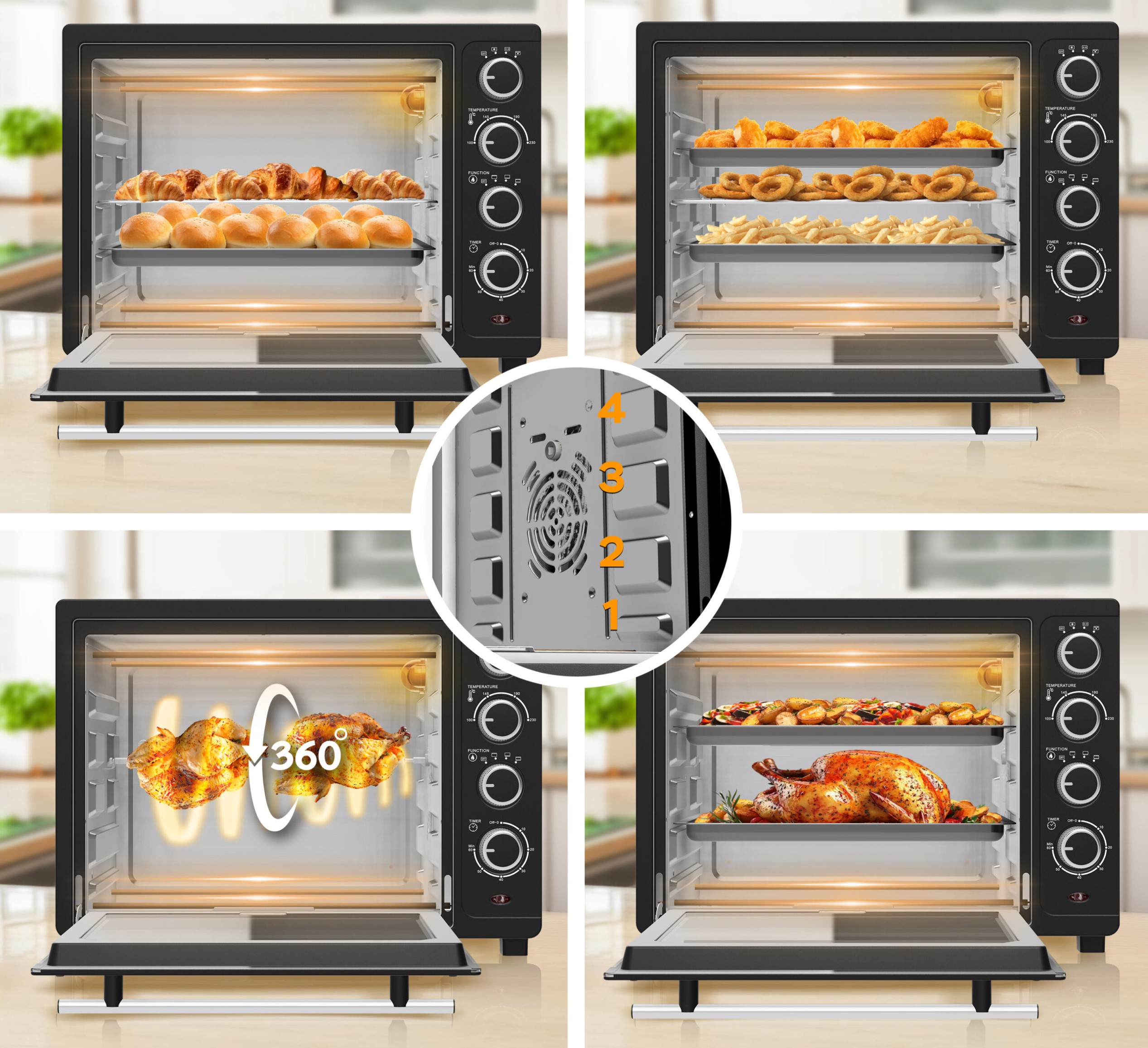 Urządzenie wyposażone jest w rożen oraz funkcję termoobiegu, które zapewniają równomierne rozprowadzanie ciepła wewnątrz komory piekarnika.
