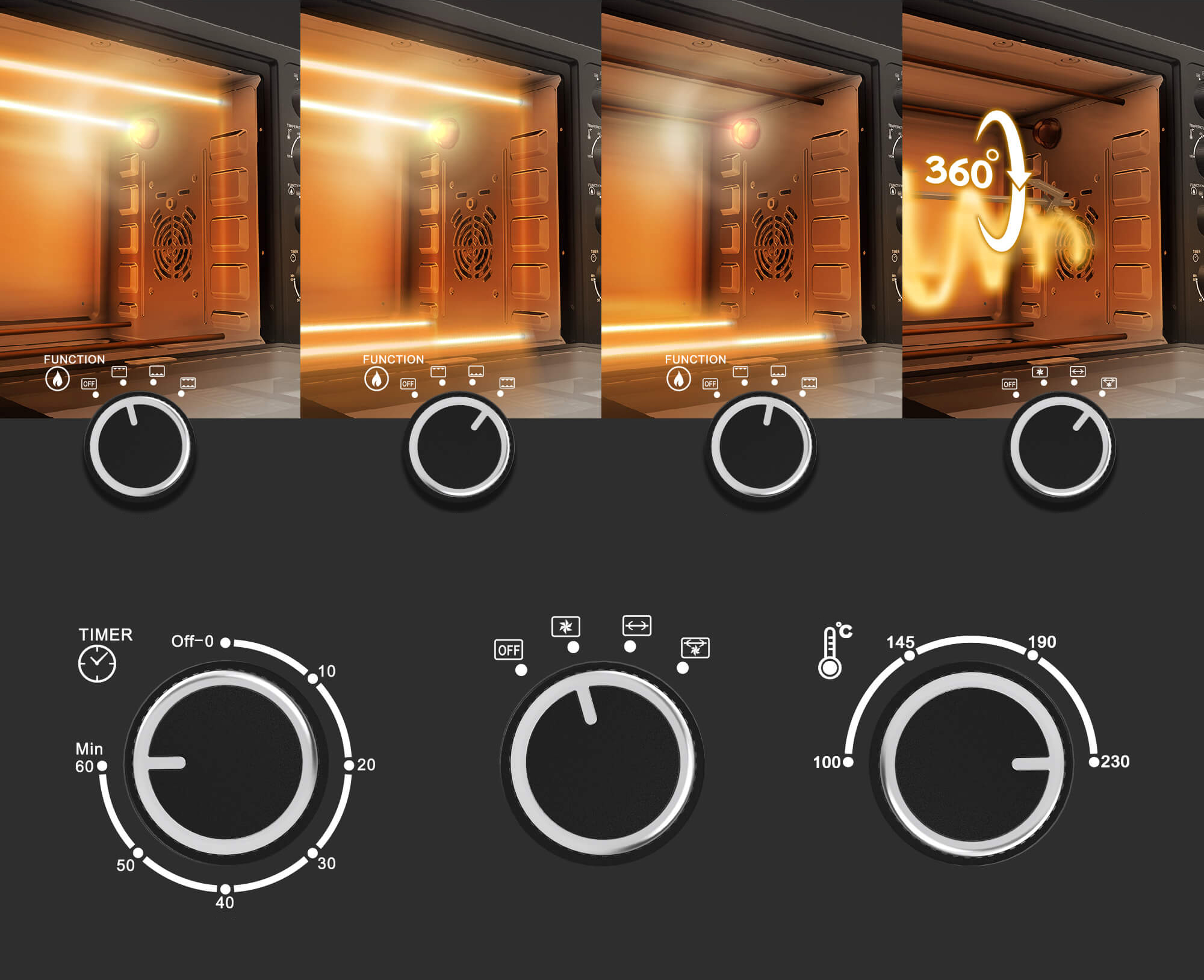 Górne i dolne grzałki, które mogą pracować osobno lub razem pozwalają na jednolite i efektywne pieczenie. Funkcja termoobiegu pozwala na równomierne rozprowadzanie ciepła wewnątrz piekarnika, a rożen jest doskonałym dodatkiem do przygotowywania mięsa.