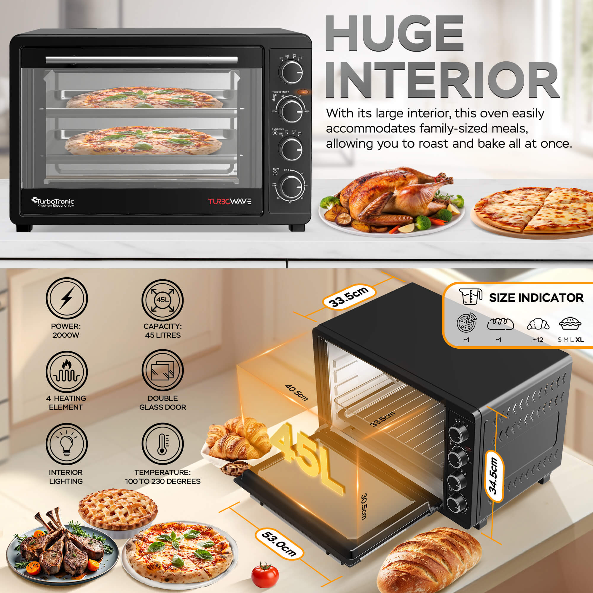 Piekarnik jest wyposażony w funkcje, które umożliwiają precyzyjne i łatwe pieczenie potraw. Pojemność 45 litrów i moc 2000 W pozwala na szybkie i efektywne nagrzanie piekarnika.