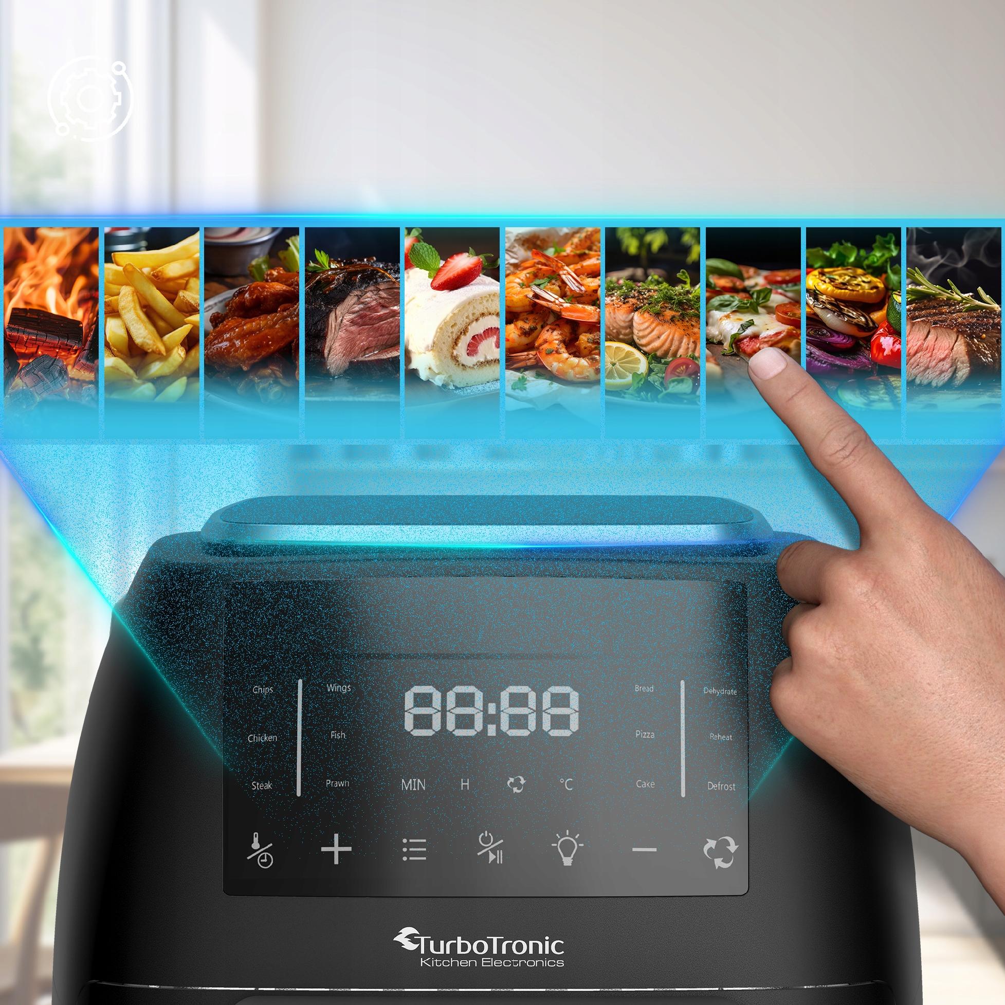 Intuicyjna obsługa jednym dotknięciem! Dotykowy panel sterowania to nowoczesne i wygodne rozwiązanie, które pozwala Ci w mgnieniu oka ustawić odpowiedni tryb pracy. Do wyboru masz szereg automatycznych programów dopasowanych do najpopularniejszych potraw – od frytek, przez kurczaka, po warzywa i ciasta.