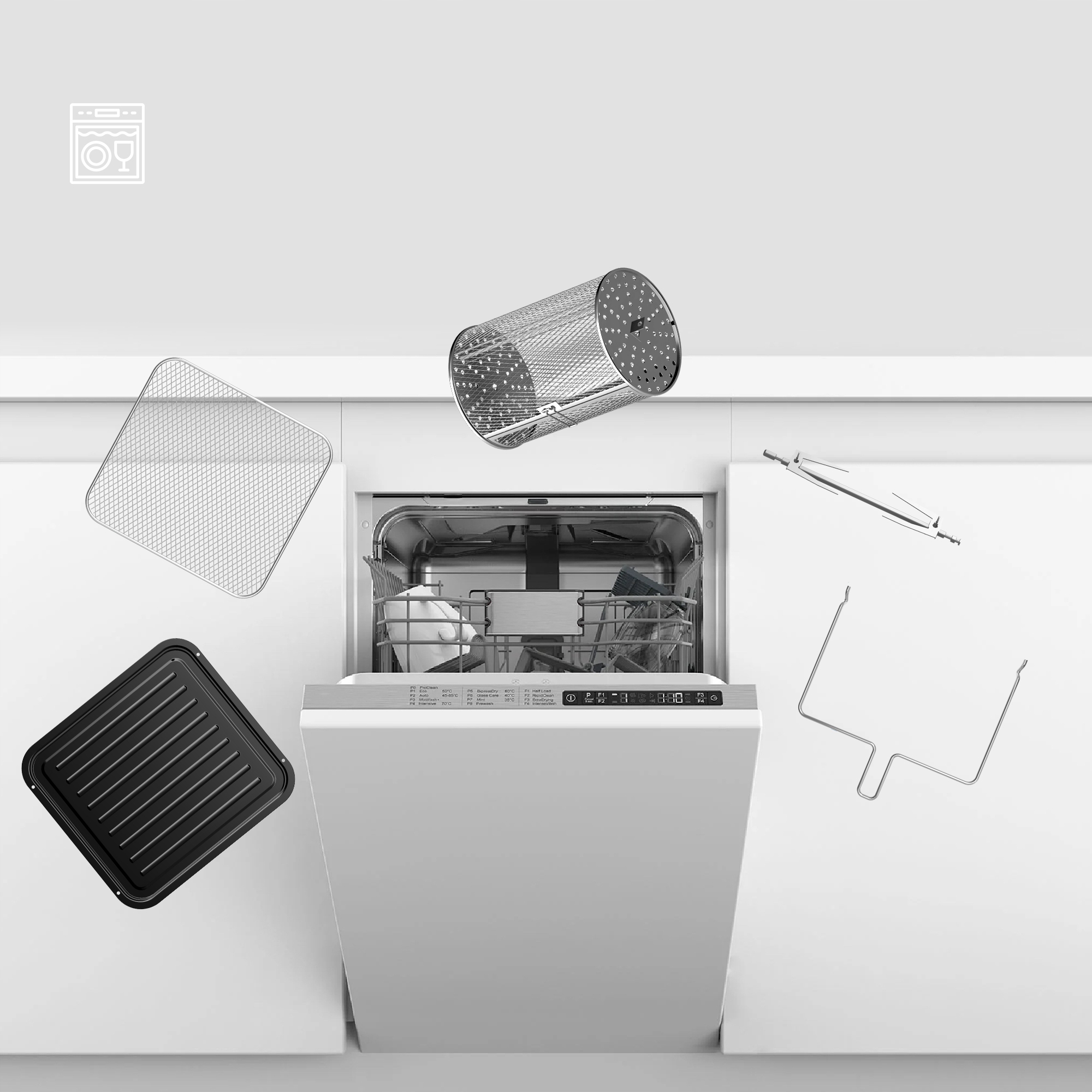 W zestawie znajdziesz metalowy ruszt, tackę ociekową, bęben do frytek i rożen – wszystkie elementy możesz wrzucić do zmywarki. Oszczędzasz czas, energię i nie musisz męczyć się z tłuszczem i resztkami.