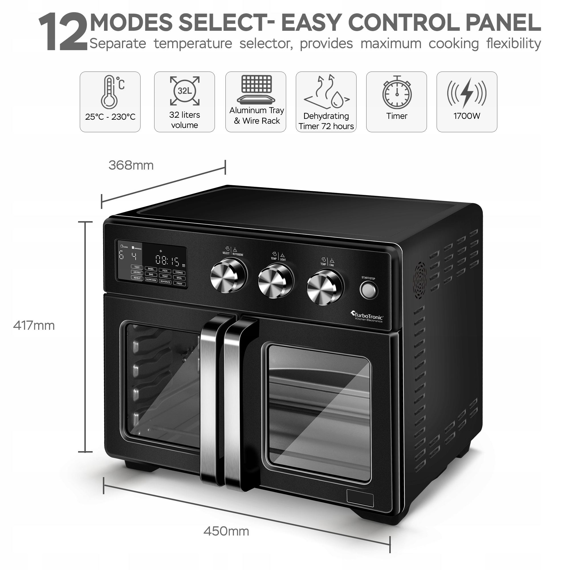Nasz piekarnik to nie tylko stylowy element wyposażenia kuchni, ale przede wszystkim wszechstronne urządzenie, które ułatwi Ci codzienne gotowanie. Dzięki pojemności 32L, mocy 1700W oraz mnogości funkcji, automatycznych programów oraz bogatemu zestawowi akcesoriów, będziesz mógł wykorzystać go do przygotowania wielu różnych dań - od pieczenia chleba po smażenie frytek bez tłuszczu, aż po suszenie owoców.