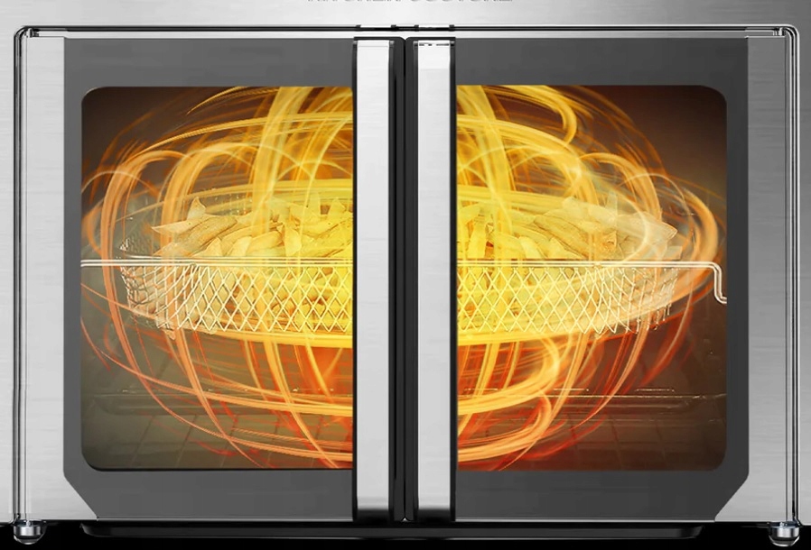 Francuskie drzwi otwierane do boku nadają urządzeniu elegancki i stylowy wygląd, a także ułatwiają umieszczanie i wyjmowanie potraw z wnętrza piekarnika.