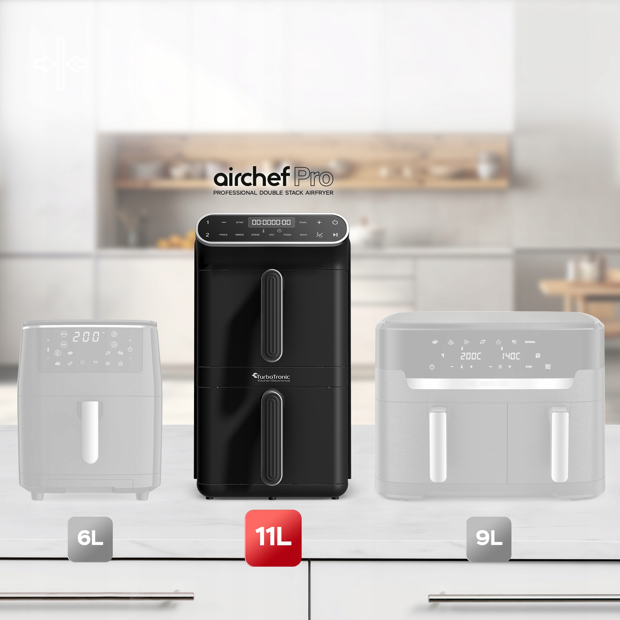 Choć mieści aż 11 litrów, jest bardziej kompaktowa niż standardowe frytkownice 6L czy nawet 9L – idealna do każdej kuchni, nawet tej z ograniczoną przestrzenią.