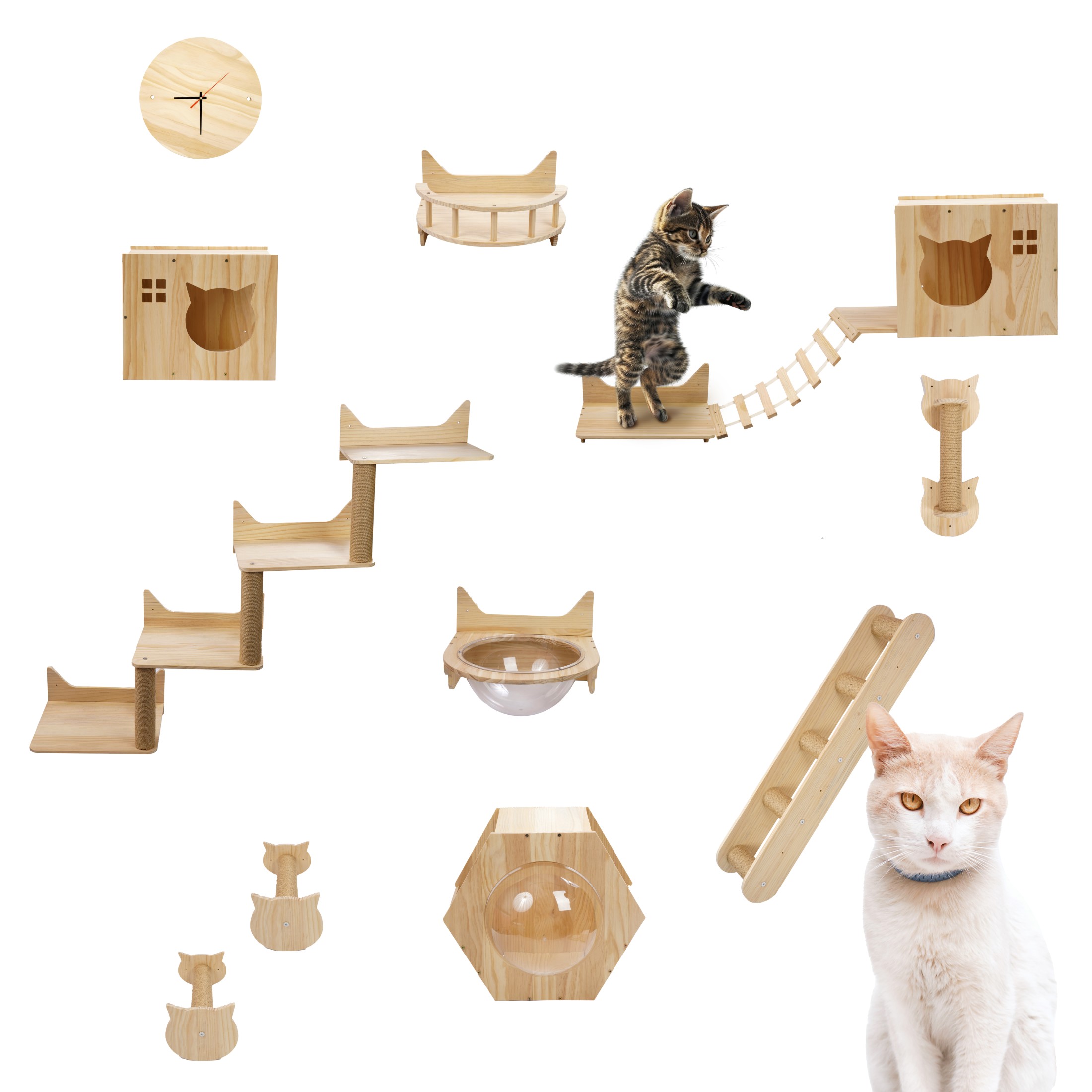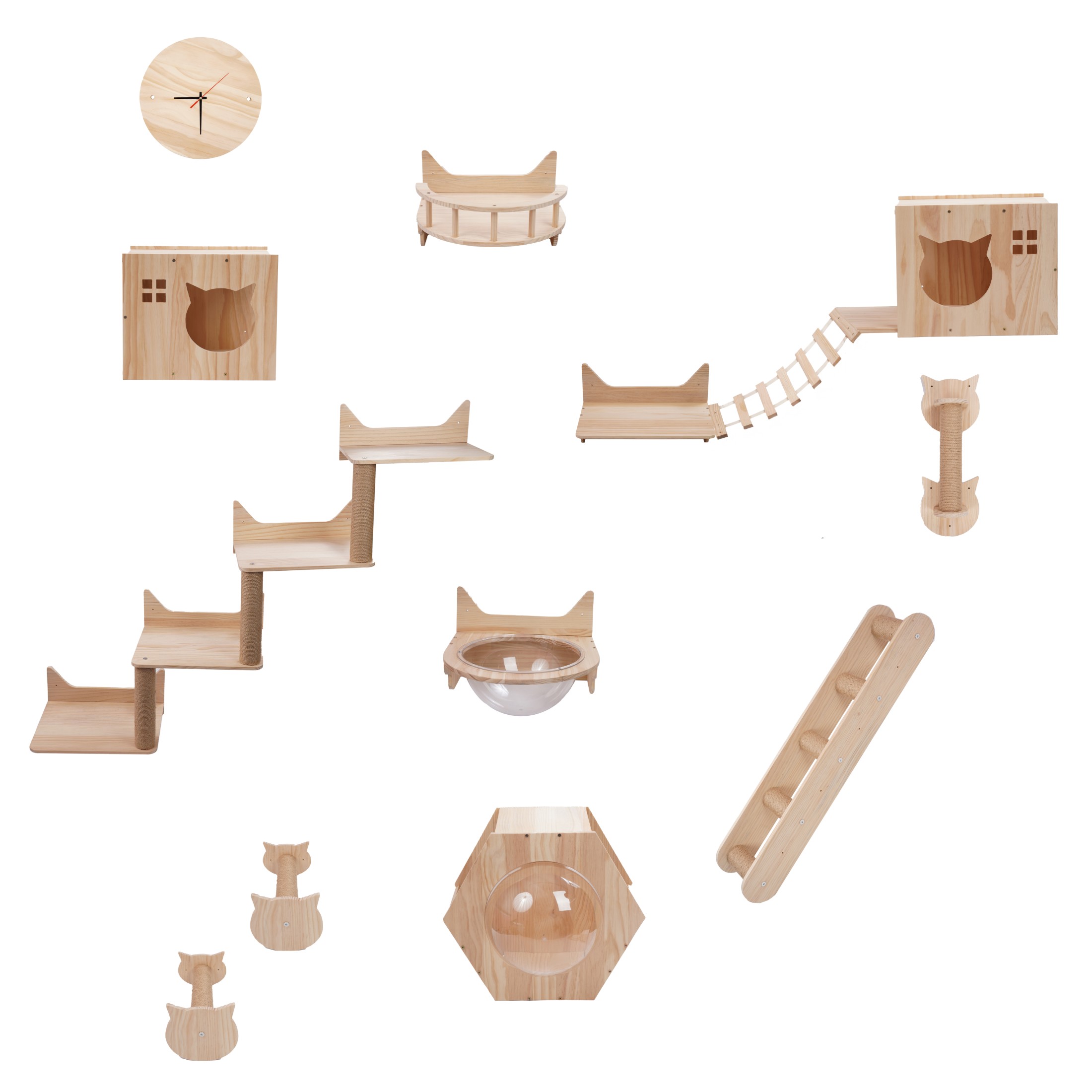 ✨ Wszystkie elementy montowane są na ścianie i można je rozmieszczać dowolnie, według własnego uznania i dostępnej przestrzeni. Dzięki temu stworzysz unikalną aranżację dopasowaną zarówno do stylu wnętrza, jak i temperamentu Twojego kota.