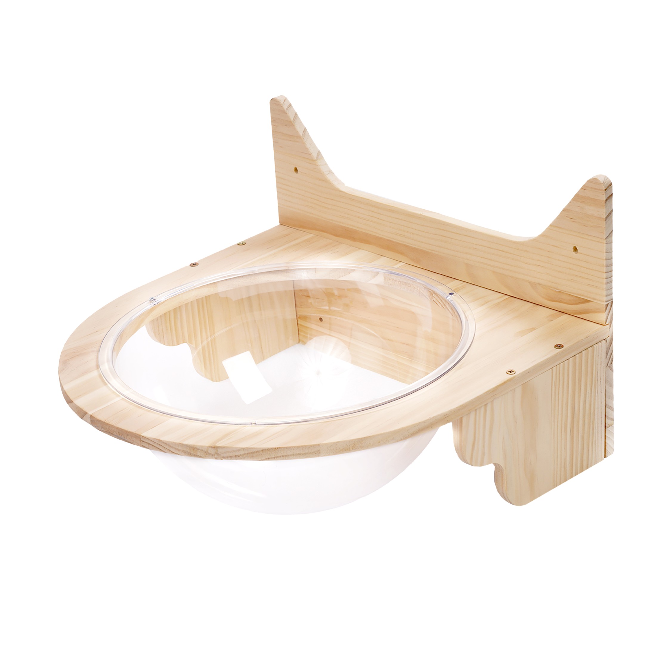 - Przezroczysta, wisząca miska – oryginalne legowisko zawieszone w powietrzu, z którego kot może obserwować otoczenie lub wygodnie się w nim ułożyć.