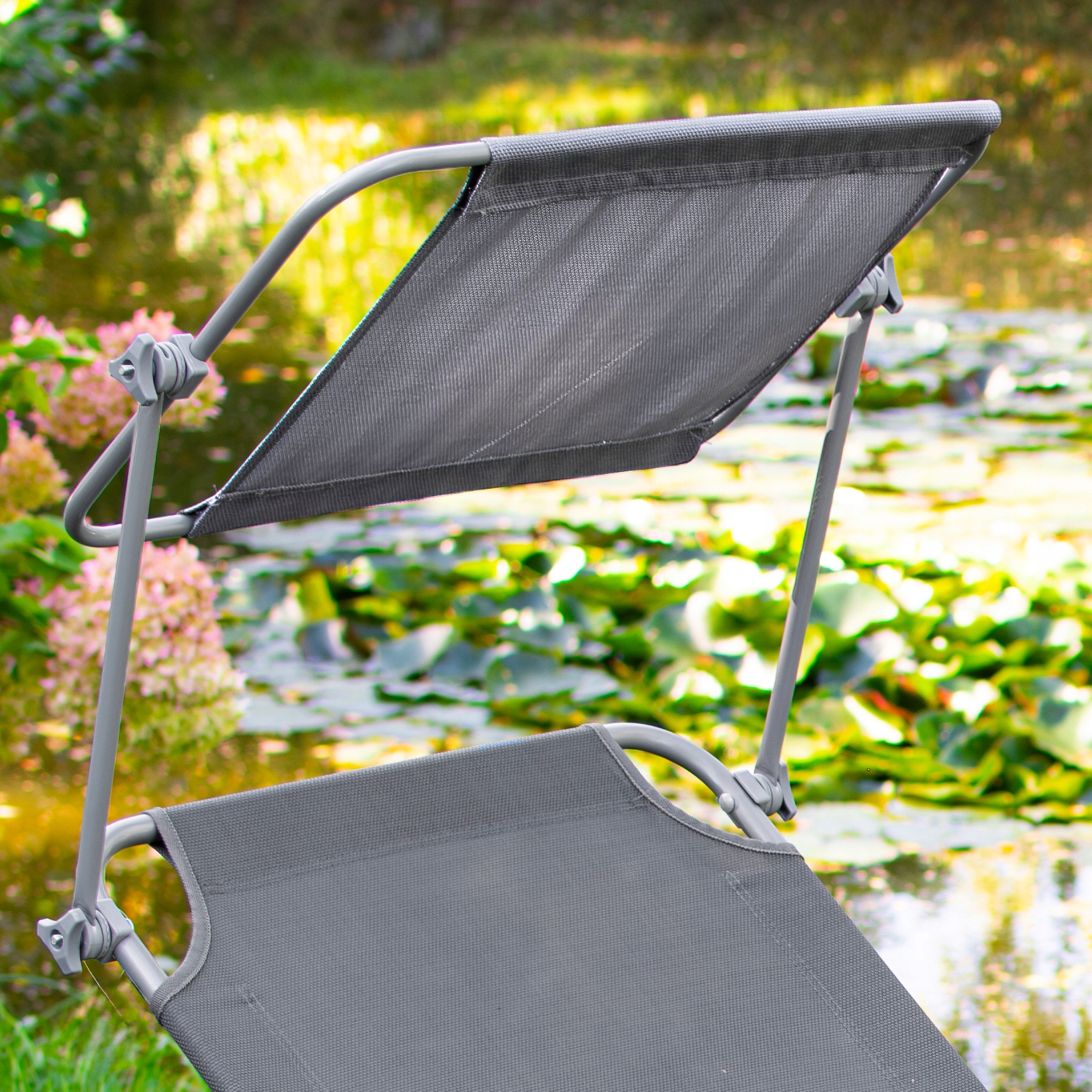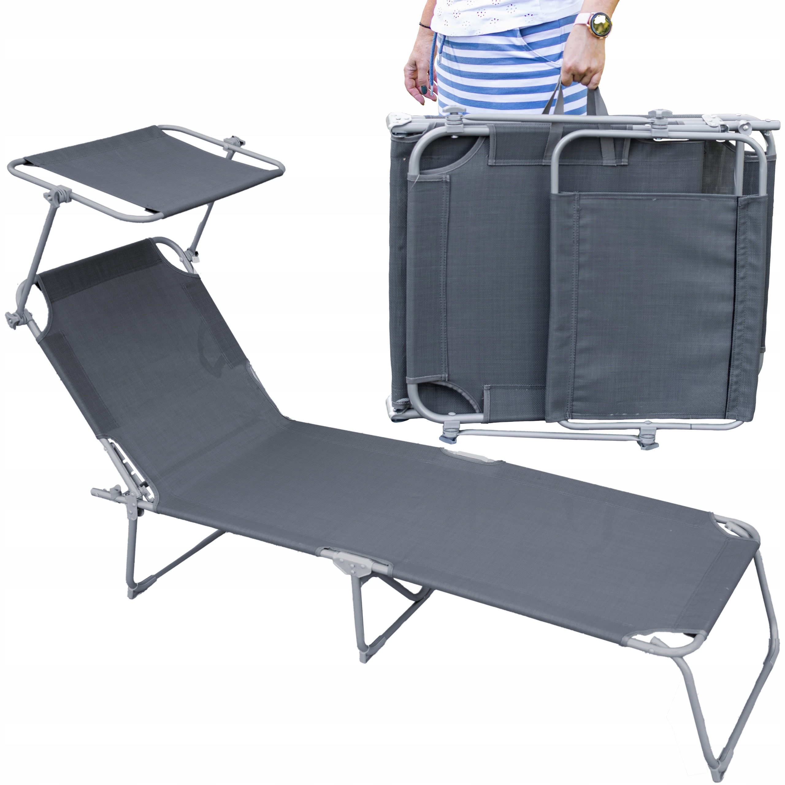 SKŁADANA LEŻANKA OGRODOWY Z ZADASZENIEM SZARY STAL FOTEL PLAŻOWY LEŻAK