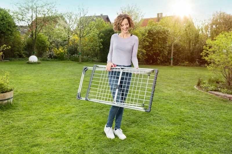 Dzięki aluminiowym linkom jest odporna na rdzę i trudne warunki atmosferyczne. Suszarka do ubrań Viledy może być stosowana wewnątrz domu, ale także jako suszarka balkonowa czy tarasowa.