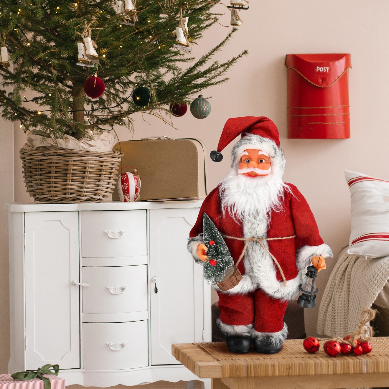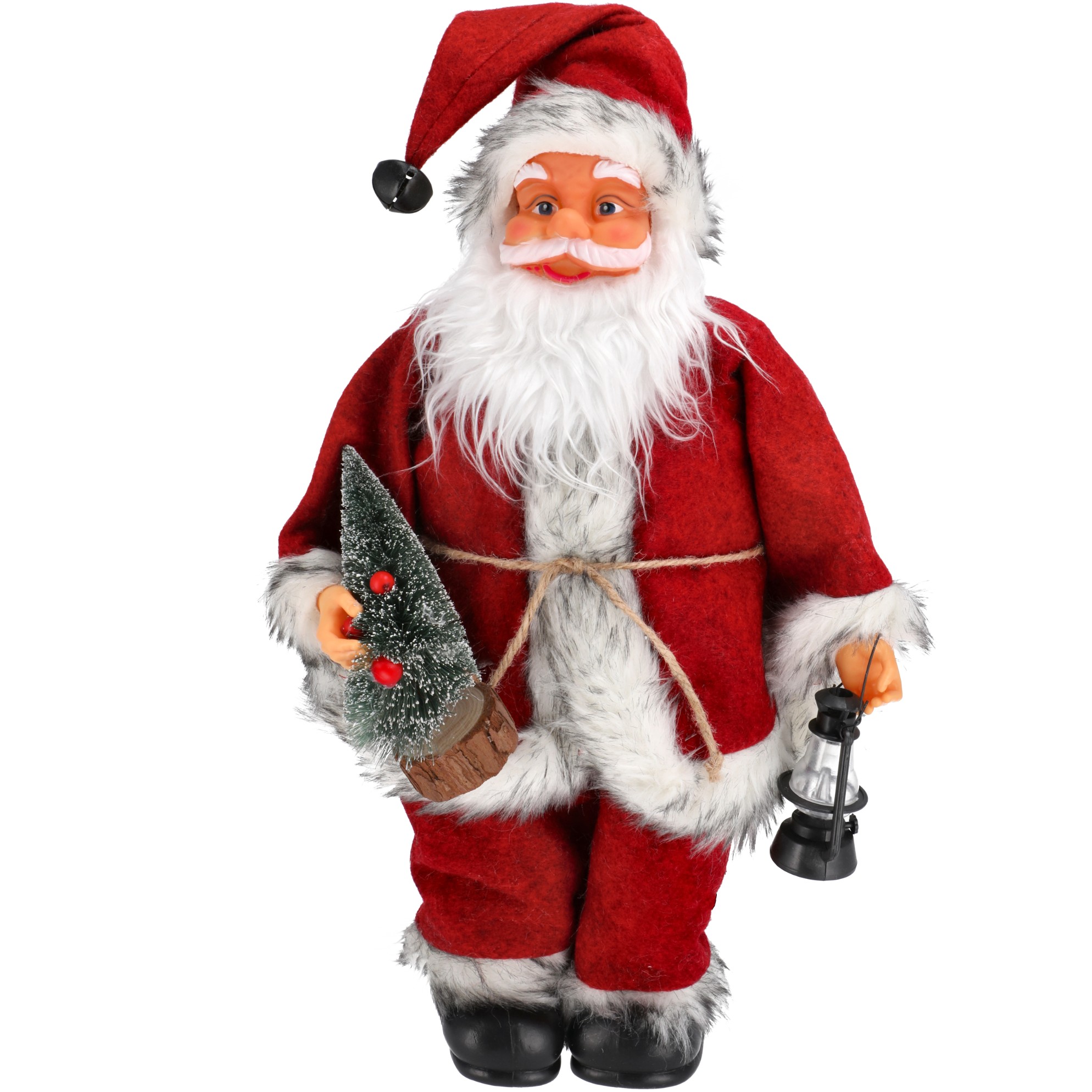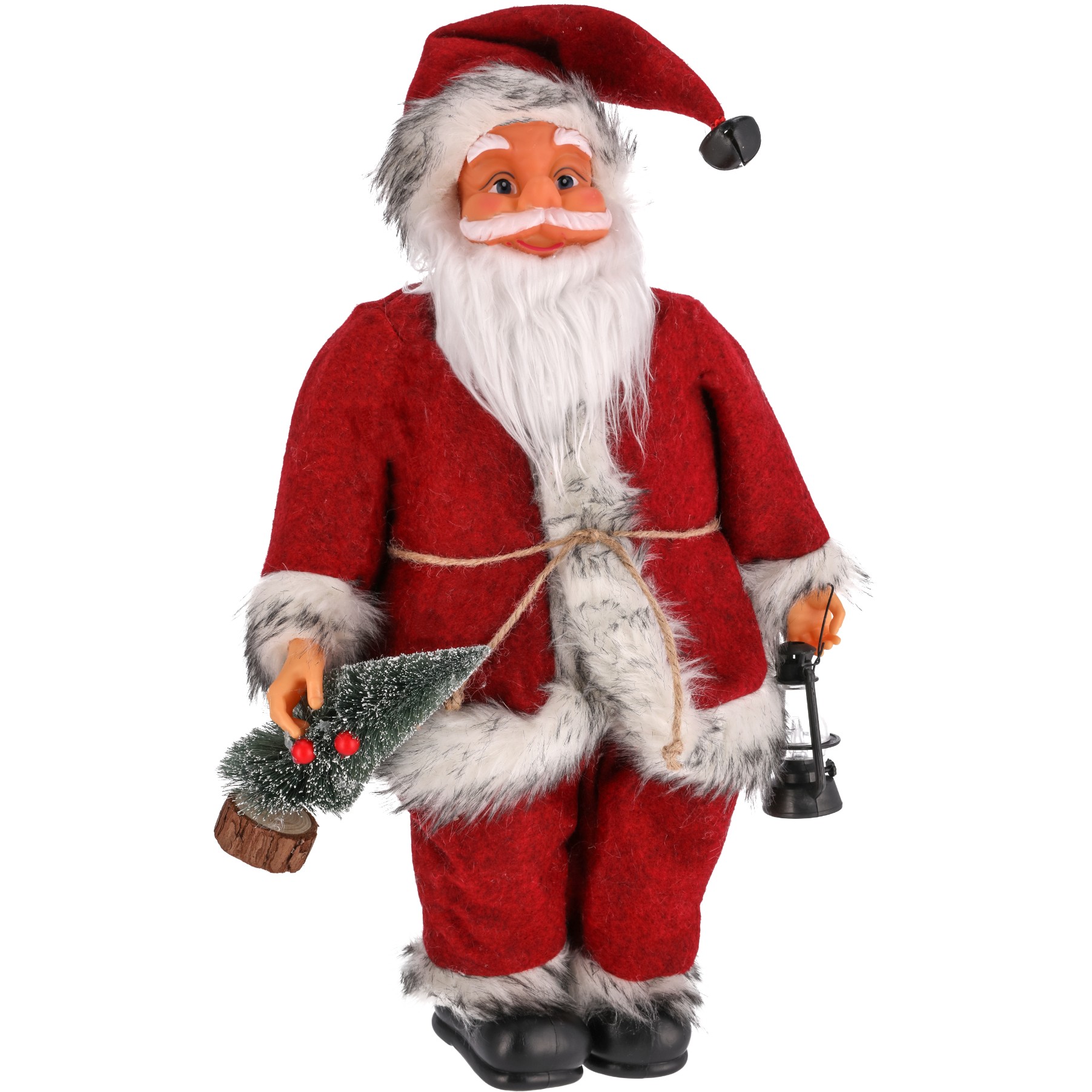 ❄️ Mikołaj ma na głowie miękką, wełnianą czapkę wykończoną puszystym futerkiem i ozdobioną dzwoneczkiem, który subtelnie pobrzękuje przy każdym dotknięciu. W jednej ręce dzierży piękna choinkę, a w drugiej niesie latarenkę. Te urocze dodatki nadają figurce charakteru i sprawiają, że wyróżnia się na tle innych dekoracji.