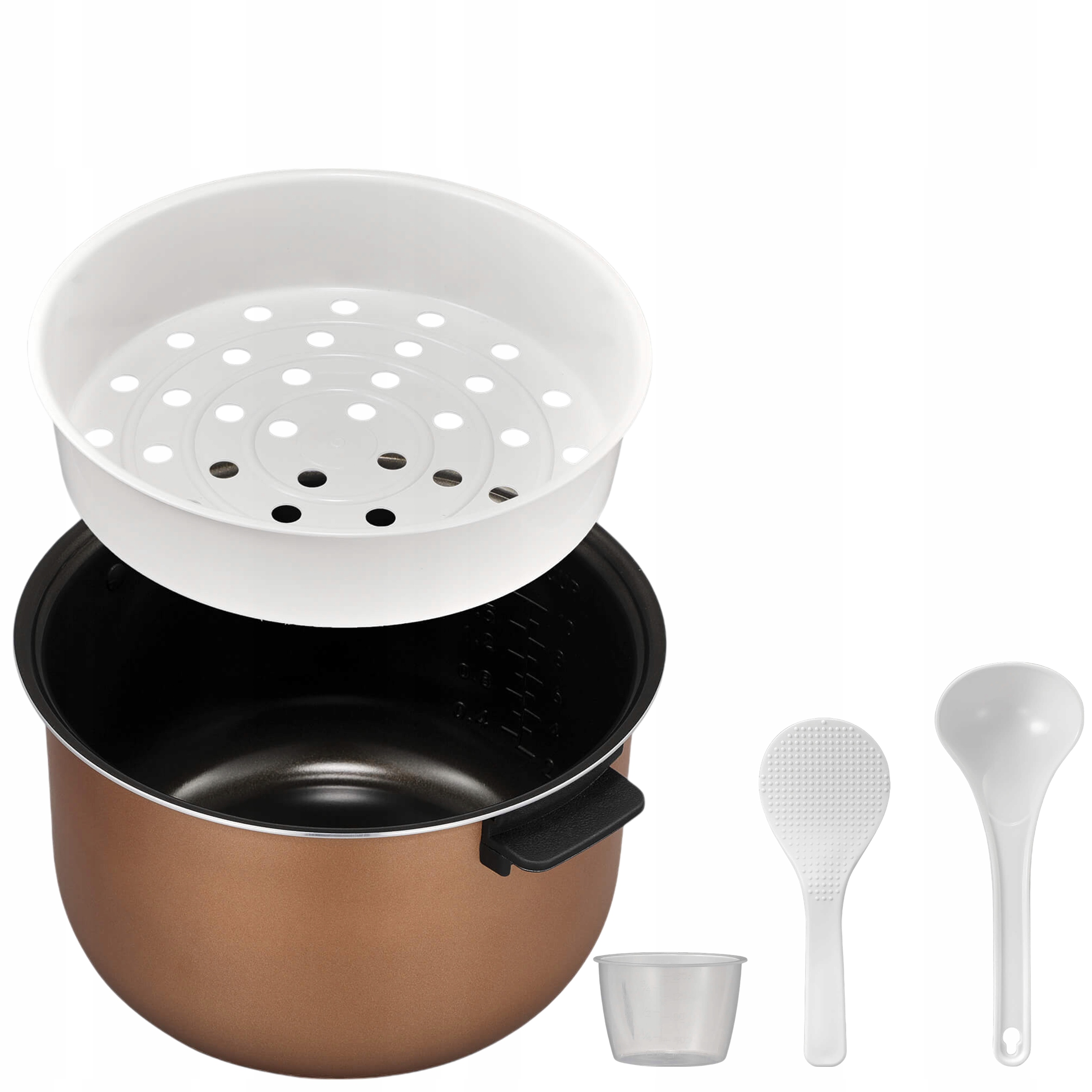 W zestawie znajdziesz 5-litrowy garnek z nieprzywierającą powłoką, tackę do gotowania na parze, chochlę, łyżkę oraz miarkę – wszystko, czego potrzebujesz, aby zacząć gotować od razu.
