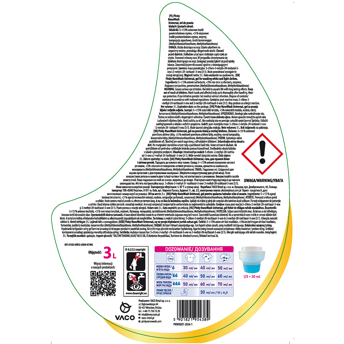Pinky NanoWash Universal to innowacyjne rozwiązanie, które łączy w sobie skuteczność działania i wygodę użytkowania. Aby maksymalnie ułatwić proces prania, produkt został wyposażony w praktyczną miarkę umieszczoną w zakrętce. To intuicyjne rozwiązanie sprawia, że dozowanie odpowiedniej ilości detergentu staje się proste i bezproblemowe, pozwalając na optymalne wykorzystanie produktu bez marnowania go.