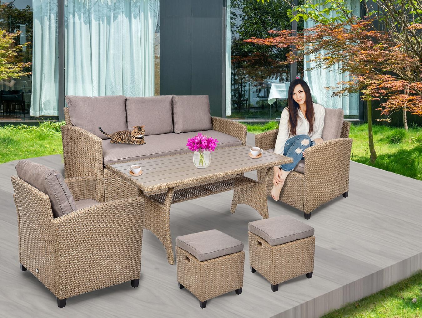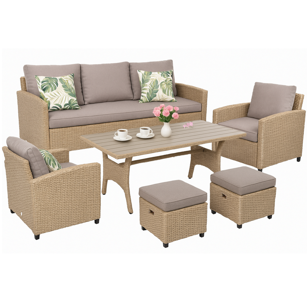 ➡️ Funkcjonalne meble ogrodowe MILANO dla 7 osób to zestaw w którego skład wchodzi trzyosobowa sofa, dwa fotele, dwie pufy oraz prostokątny stół. Ten zestaw ogrodowy z technorattanu wygląda stylowo, a szerokie siedziska z poduszkami podwyższają komfort wypoczynku.