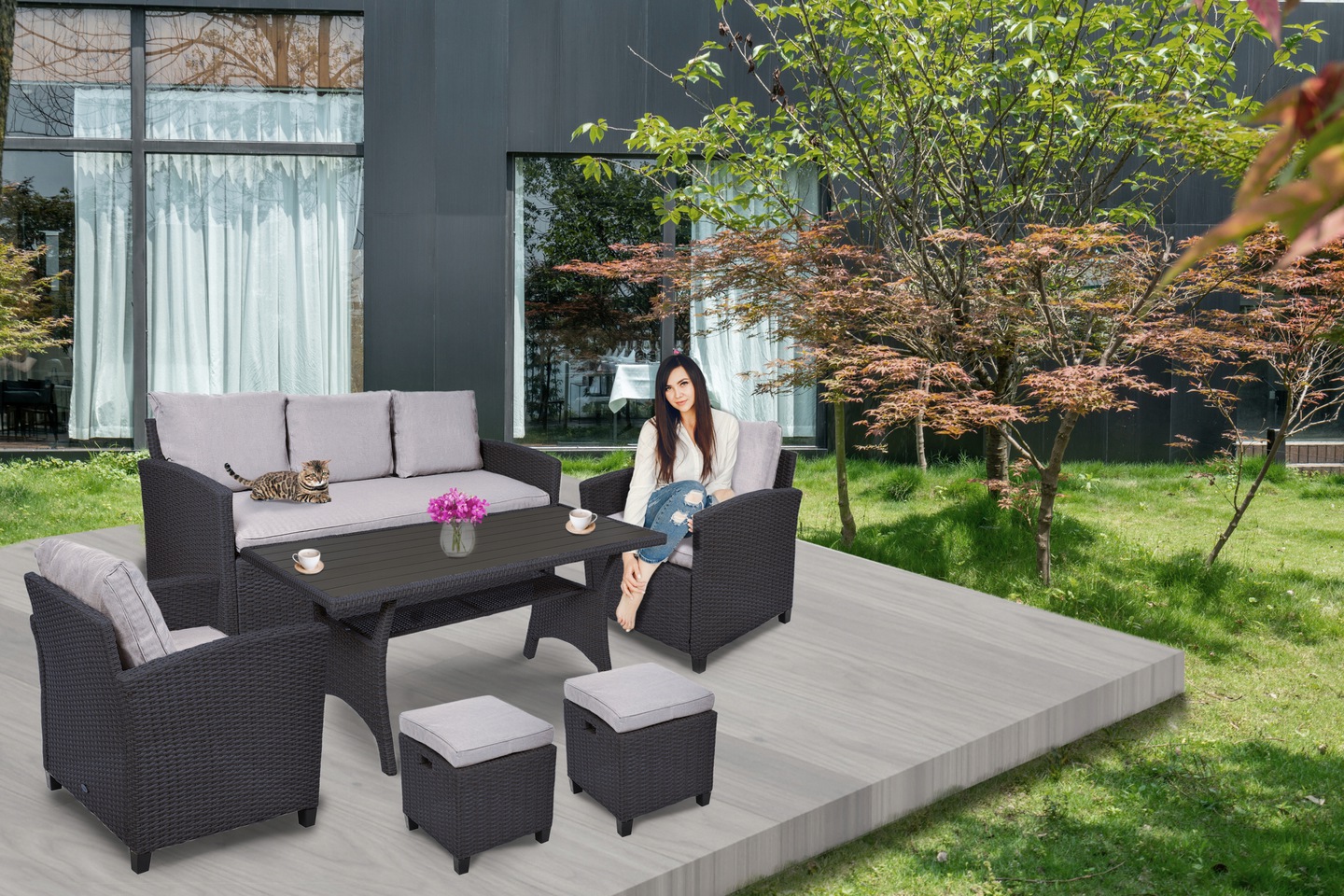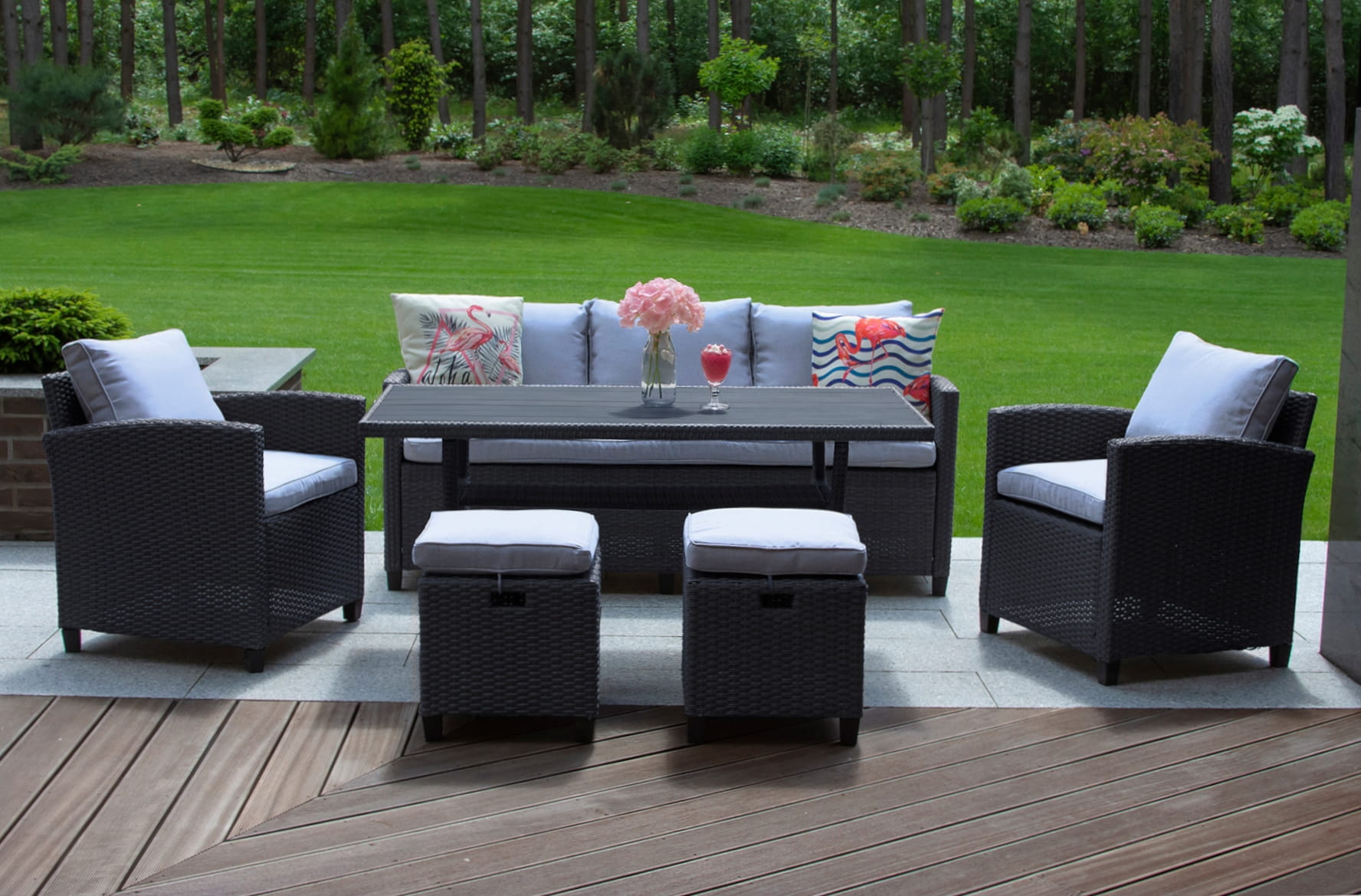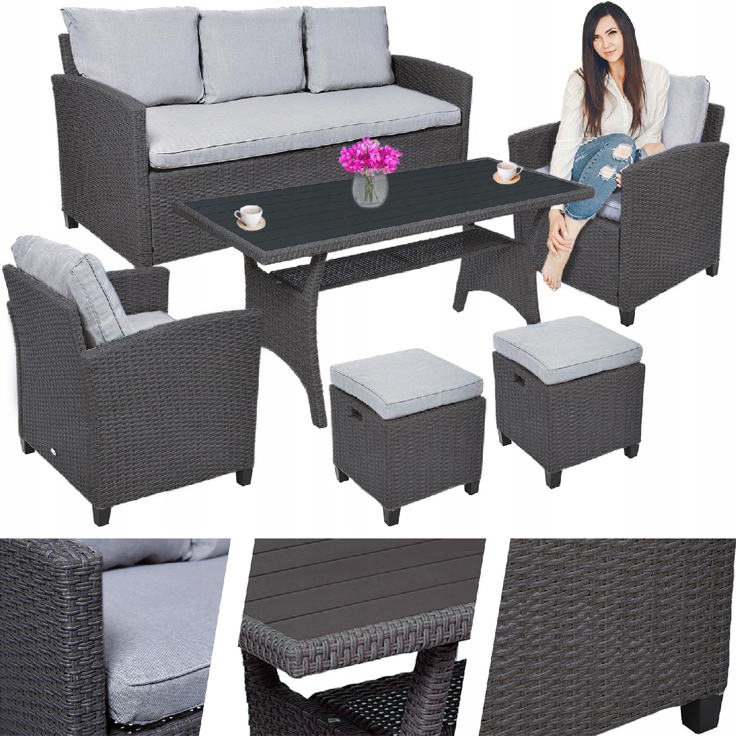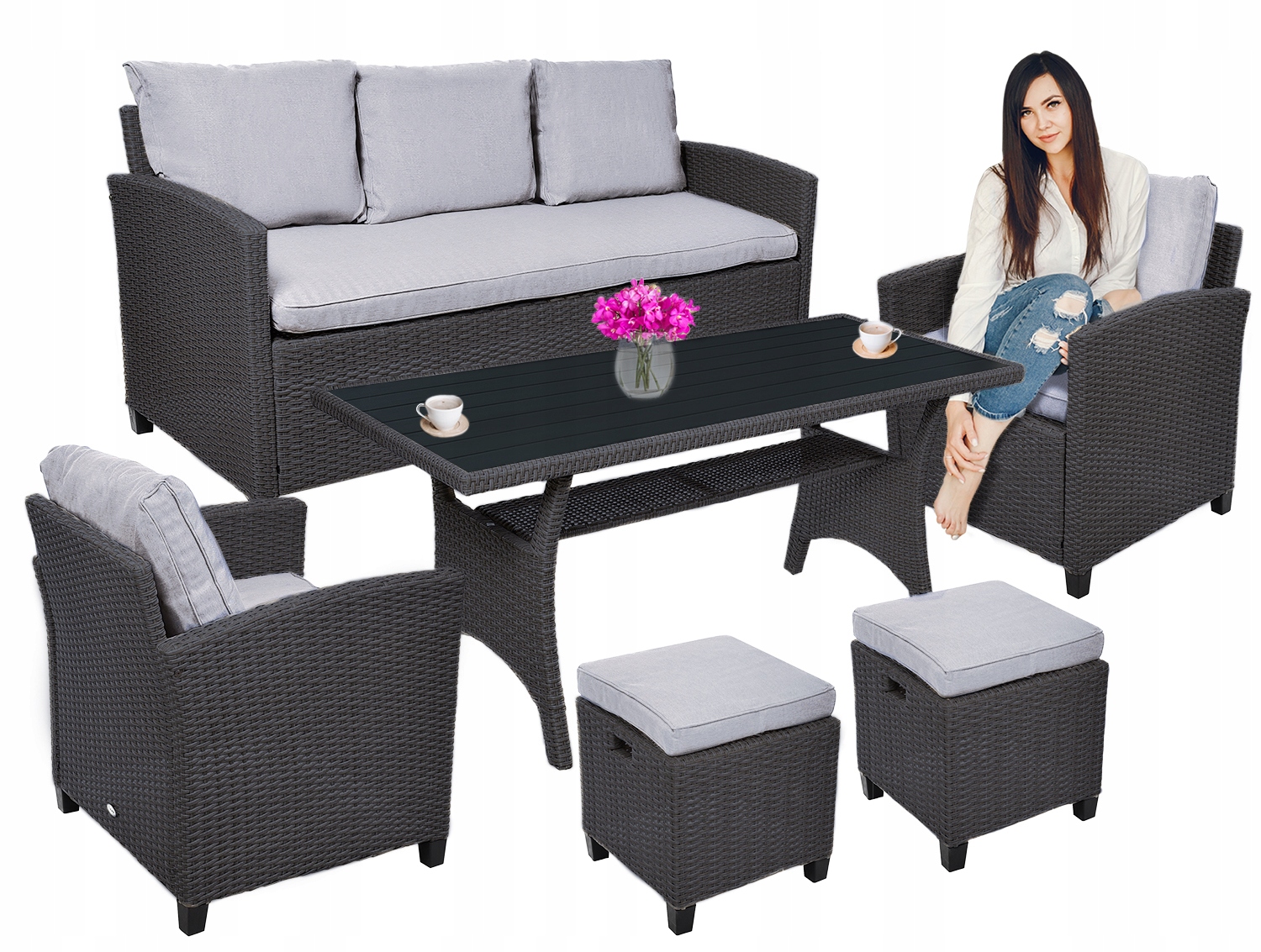 - Funkcjonalne meble ogrodowe MILANO dla 7 osób to zestaw w którego skład wchodzi trzyosobowa sofa, dwa fotele, dwie pufy oraz prostokątny stół. Ten zestaw ogrodowy z technorattanu wygląda stylowo, a szeroki